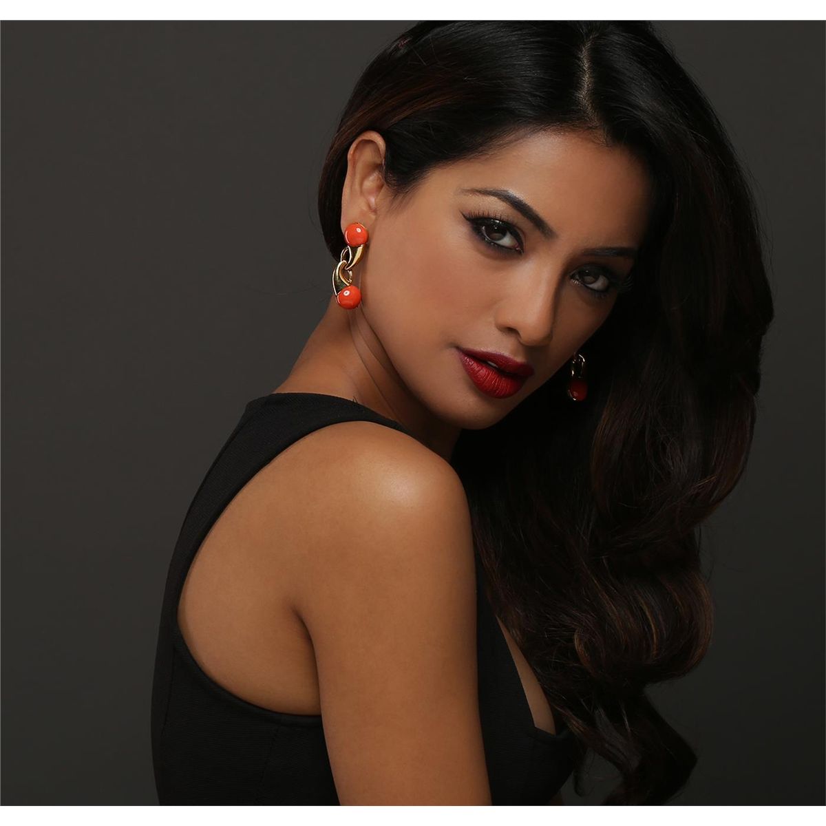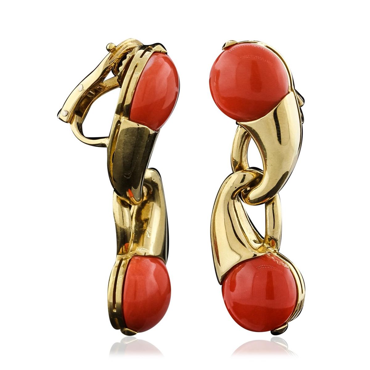 One pair electronically tested 18KT yellow gold ladies cast designer earrings with Omega clip backs with a bright polish finish. Trademark is Sabbadini. Identified with markings of "750". Condition is new. Containing: Four prong set round cabochon cut natural red corals, measuring 13.51 x 13.51 x 4.49mm, approximate total weight of 23.44ct., medium, moderately strong, red color, (GIA R 5/4), cut is very good. All colored gemstones are graded in the mounting, unless otherwise stated. Total Weight of Colored Stones 23.44ct. Total Weight of Earrings 38.00 grams. GGL Appraised at $28,385.00.