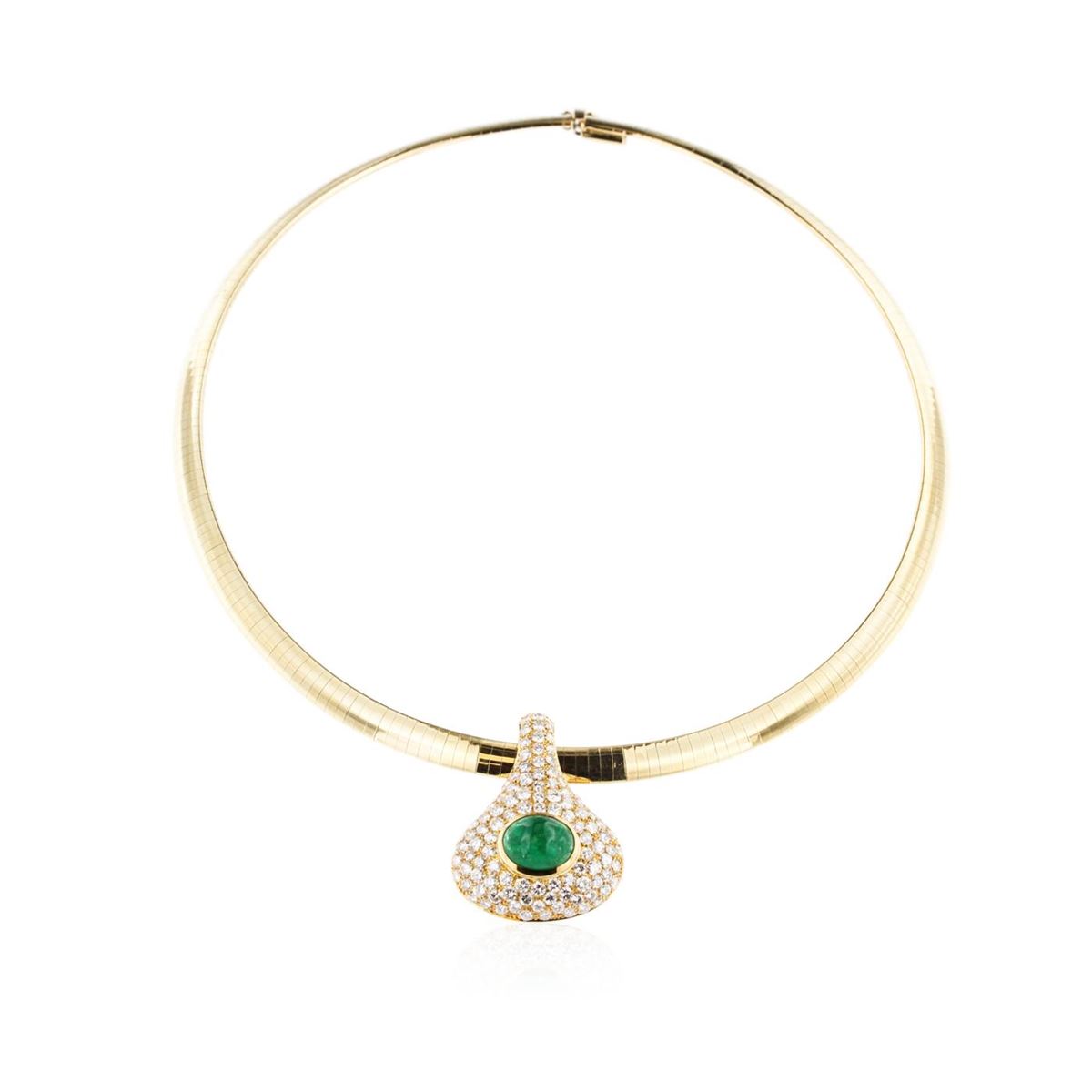 One electronically tested 18KT Yellow Gold ladies cast & assembled emerald and diamond enhancer with chain. Condition is Good. The pendant features an emerald set within a diamond bezel, completed by a diamond set hinged snap locking bail. The pendant is supported by a 14KT Yellow Gold sixteen and one-half inch length omega style chain terminating in a concealed clasp with safety. Bright polish finish. Identified with markings of "18K/14K". Containing: One bezel set oval cabochon cut natural emerald, measuring 10.40 x 8.35 x 4.70mm, approximate weight of 3.00ct., clarity is severely included, type III, medium dark, moderately strong, very slightly bluish green color, (GIA vslbG 6/4), cut is Good. Transmitting light with a minimum of distortion, transparent to translucent. Naturally occurring internal & external characteristics are present. Indications of oil residue. Graded in the setting. One Hundred Eighteen pave‚ set round brilliant cut diamonds, measuring 2.40 - 1.90 x 1.29mm (depth est.) approximate total weight of 118 Stones = 4.48ct. Graded in the setting. Clarity: VS-2 to SI-2. Color: F - G. Total Weight of Colored Stones 3.00ct. Total Weight of Diamonds 4.48ct. Total Weight of Enhancer with chain 53.30 grams. AIG Appraised at $32,050.00.