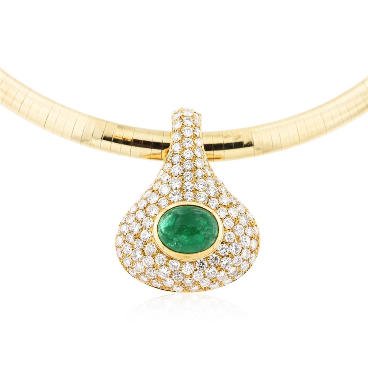 One electronically tested 18KT Yellow Gold ladies cast & assembled emerald and diamond enhancer with chain. Condition is Good. The pendant features an emerald set within a diamond bezel, completed by a diamond set hinged snap locking bail. The pendant is supported by a 14KT Yellow Gold sixteen and one-half inch length omega style chain terminating in a concealed clasp with safety. Bright polish finish. Identified with markings of "18K/14K". Containing: One bezel set oval cabochon cut natural emerald, measuring 10.40 x 8.35 x 4.70mm, approximate weight of 3.00ct., clarity is severely included, type III, medium dark, moderately strong, very slightly bluish green color, (GIA vslbG 6/4), cut is Good. Transmitting light with a minimum of distortion, transparent to translucent. Naturally occurring internal & external characteristics are present. Indications of oil residue. Graded in the setting. One Hundred Eighteen pave‚ set round brilliant cut diamonds, measuring 2.40 - 1.90 x 1.29mm (depth est.) approximate total weight of 118 Stones = 4.48ct. Graded in the setting. Clarity: VS-2 to SI-2. Color: F - G. Total Weight of Colored Stones 3.00ct. Total Weight of Diamonds 4.48ct. Total Weight of Enhancer with chain 53.30 grams. AIG Appraised at $32,050.00.