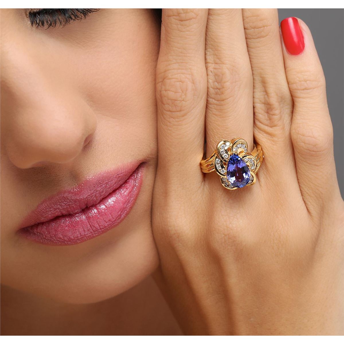 One electronically tested 18KT yellow gold ladies combination cast & assembled tanzanite and diamond ring with a bright polish finish. Identified with markings of "18K". Condition is new. Containing: One prong set pear modified brilliant cut natural tanzanite, measuring 10.85 x 7.63 x 5.40mm, approximate weight of 3.00ct., clarity is eye clean, type I, medium, moderately strong, blue color, (GIA B 5/4), cut is very good. Twenty-Four channel set round brilliant cut diamonds, measuring 1.50 - 1.50 x 0.90mm (depth est.) approximate total weight of 24 Stones = 0.30ct. Clarity: SI-1. Color: I - J, Cut is Good. Colored gemstones are presumed to have been subjected to commonly used enhancement processes. All diamonds and colored gemstones are graded in the mounting, unless otherwise stated. Total Weight of Colored Stones 3.00ct. Total Weight of Diamonds 0.30ct. Total Weight of Ring 11.90 grams. GGL Appraised at $6,815.00.