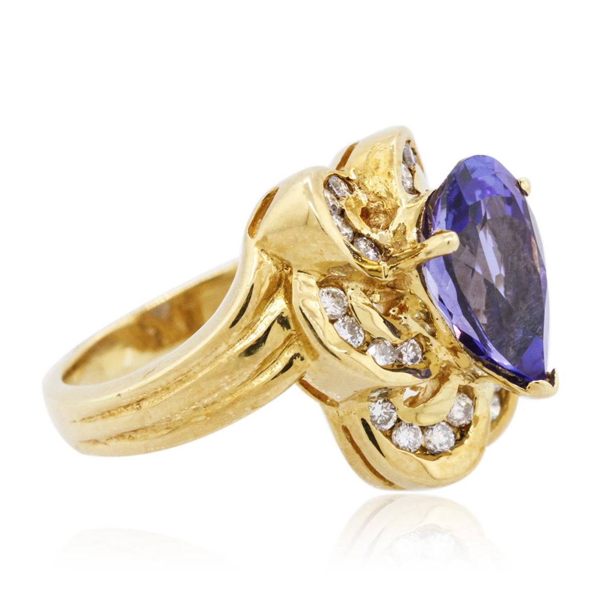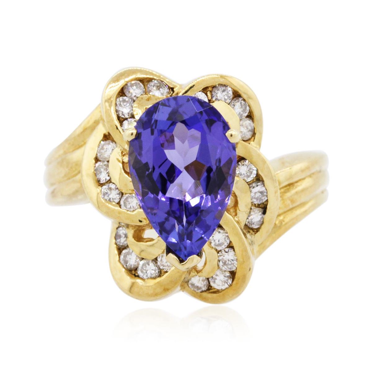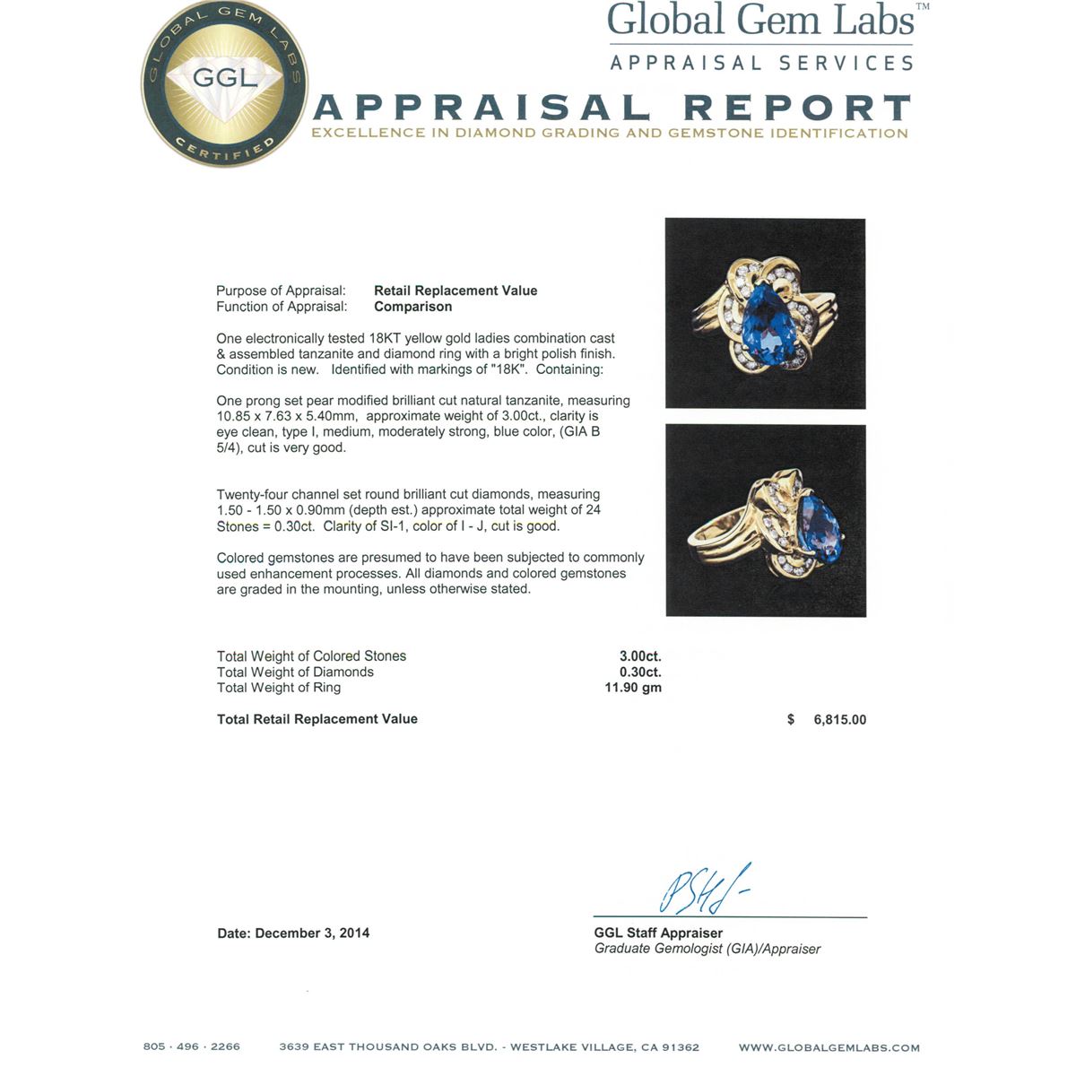One electronically tested 18KT yellow gold ladies combination cast & assembled tanzanite and diamond ring with a bright polish finish. Identified with markings of "18K". Condition is new. Containing: One prong set pear modified brilliant cut natural tanzanite, measuring 10.85 x 7.63 x 5.40mm, approximate weight of 3.00ct., clarity is eye clean, type I, medium, moderately strong, blue color, (GIA B 5/4), cut is very good. Twenty-Four channel set round brilliant cut diamonds, measuring 1.50 - 1.50 x 0.90mm (depth est.) approximate total weight of 24 Stones = 0.30ct. Clarity: SI-1. Color: I - J, Cut is Good. Colored gemstones are presumed to have been subjected to commonly used enhancement processes. All diamonds and colored gemstones are graded in the mounting, unless otherwise stated. Total Weight of Colored Stones 3.00ct. Total Weight of Diamonds 0.30ct. Total Weight of Ring 11.90 grams. GGL Appraised at $6,815.00.