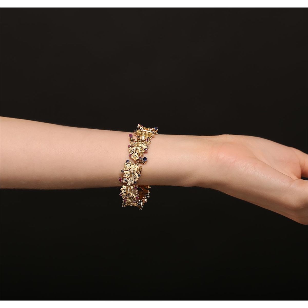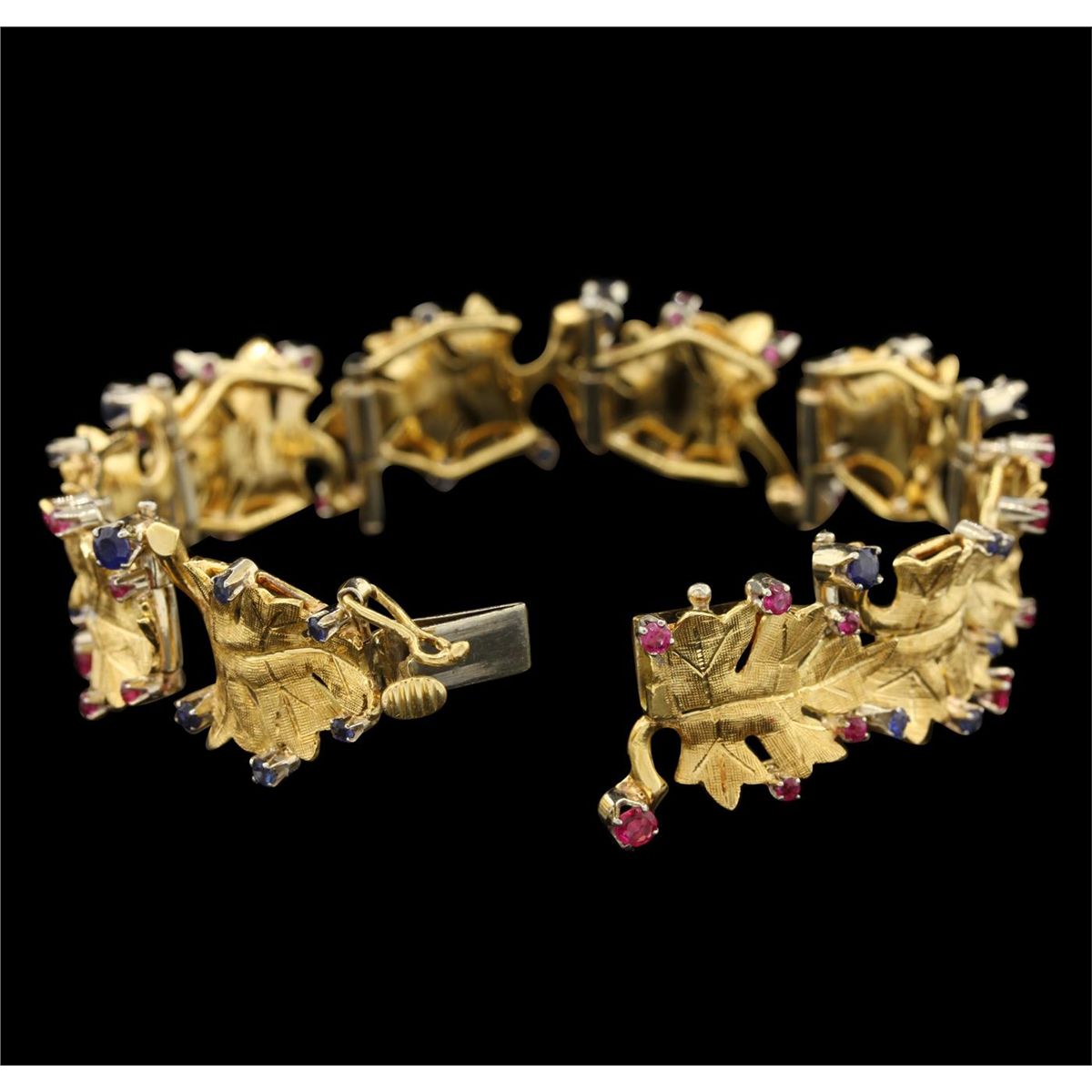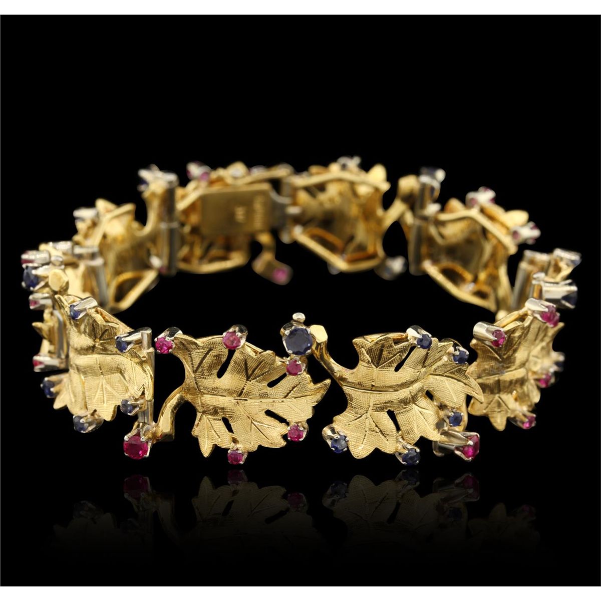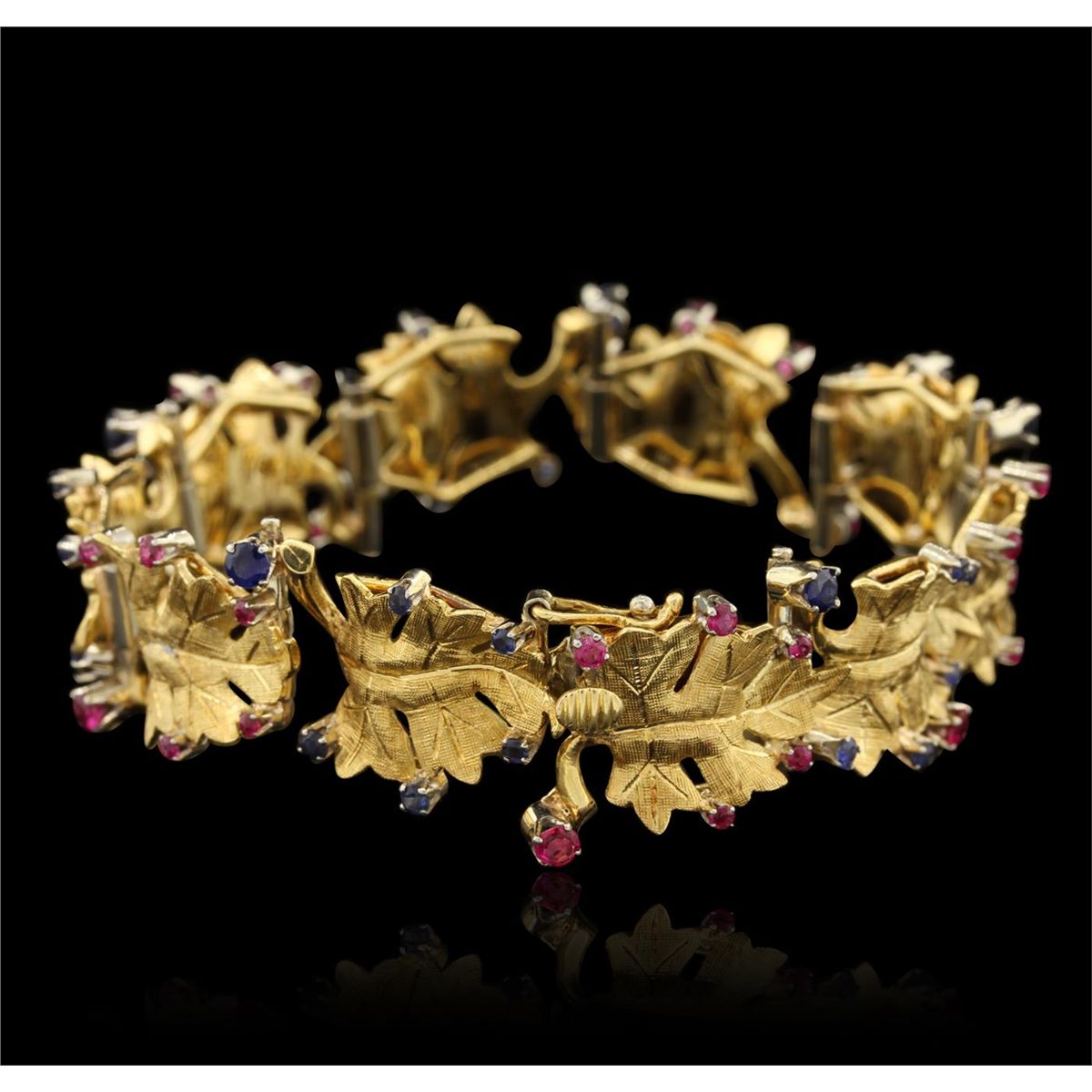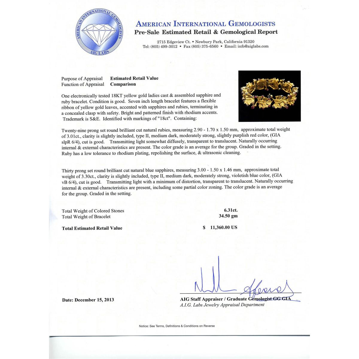One electronically tested 18KT yellow gold ladies cast & assembled sapphire and ruby bracelet. Seven inch length bracelet features a flexible ribbon of yellow gold leaves, accented with sapphires and rubies, terminating in a concealed clasp with safety. Bright and patterned finish with rhodium accents. Trademark is S&E. Identified with markings of "18ct". Condition is good. Containing: Twenty-nine prong set round brilliant cut natural rubies, measuring 2.90 - 1.70 x 1.50 mm, approximate. Total Weight of 3.01ct., clarity is slightly included, type II, medium dark, moderately strong, slightly purplish red color, (GIA slpR 6/4), cut is good. Transmitting light somewhat diffusely, transparent to translucent. Naturally occurring internal & external characteristics are present. The color grade is an average for the group. Graded in the setting. Ruby has a low tolerance to rhodium plating, repolishing the surface, & ultrasonic cleaning.Thirty prong set round brilliant cut natural blue sapphires, measuring 3.00 - 1.50 x 1.46 mm, approximate. Total Weight of 3.30ct., clarity is slightly included, type II, medium dark, moderately strong, violetish blue color, (GIA vB 6/4), cut is good. Transmitting light with a minimum of distortion, transparent to translucent. Naturally occurring internal & external characteristics are present, including some partial color zoning. The color grade is an average for the group. Graded in the setting.Total Weight of Colored Stones 6.31ct. AIG Appraised at $11,360.00.