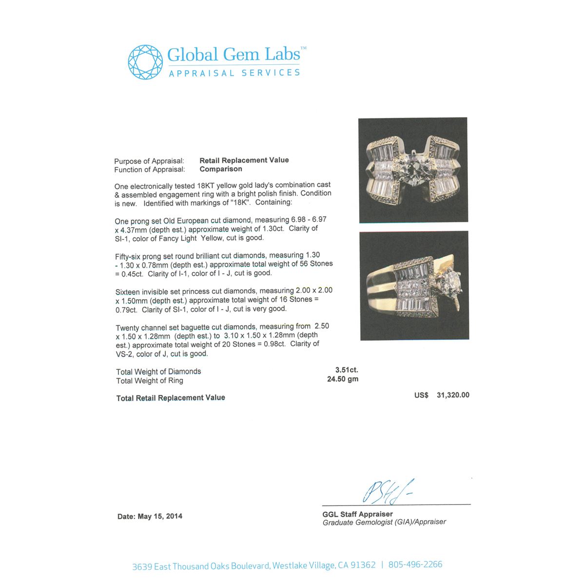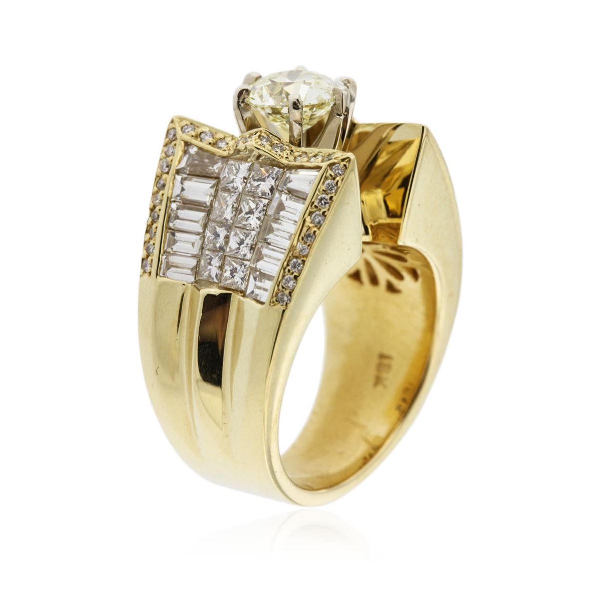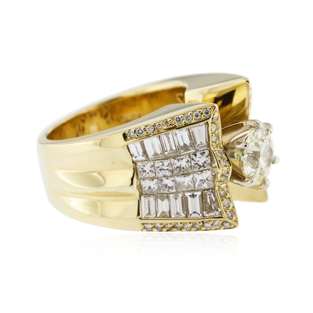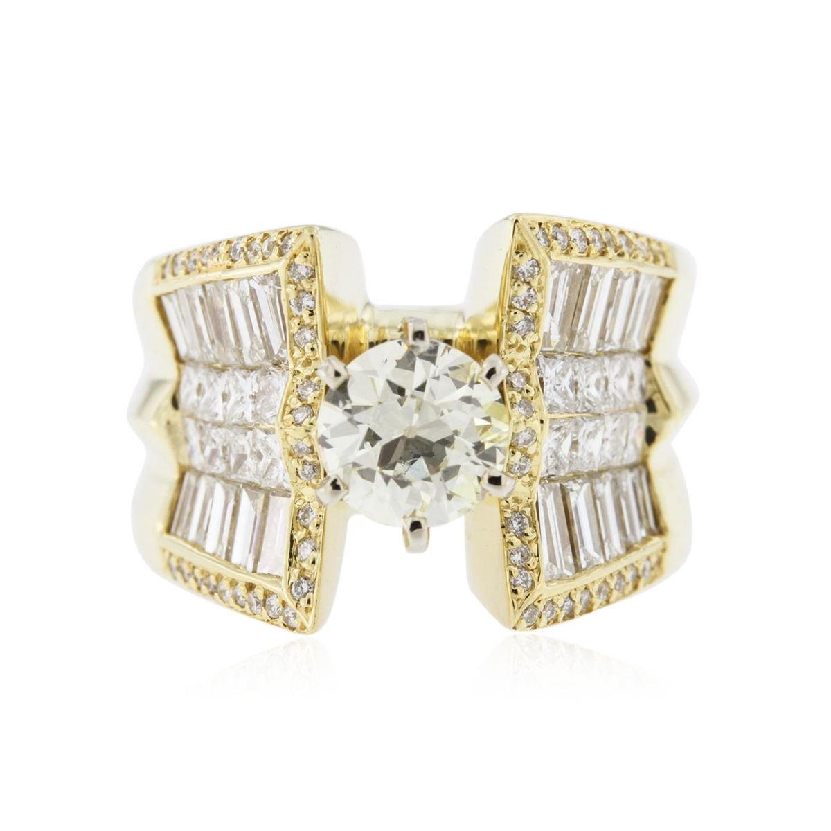 One electronically tested 18KT yellow gold Ladies combination cast & assembled engagement ring with a bright polish finish. Identified with markings of "18K". Condition is new. Containing: One prong set Old European cut diamond, measuring 6.98 - 6.97 x 4.37mm (depth est.) approximate weight of 1.30ct. Clarity: SI-1, Cut is Good. Fifty-Six prong set round brilliant cut diamonds, measuring 1.30 - 1.30 x 0.78mm (depth est.) approximate. Total Weight of 56 Stones = 0.45ct. Clarity: I-1. Color: I - J, Cut is Good. Sixteen invisible set princess cut diamonds, measuring 2.00 x 2.00 x 1.50mm (depth est.) approximate. Total Weight of 16 Stones = 0.79ct. Clarity: SI-1. Color: I - J, Cut is Very Good. Twenty channel set baguette cut diamonds, measuring from 2.50 x 1.50 x 1.28mm (depth est.) to 3.10 x 1.50 x 1.28mm (depth est.) approximate. Total Weight of 20 Stones = 0.98ct. Clarity: VS-2. Color: J, Cut is Good. Total Weight of Diamonds 3.51ct. Total Weight of Ring 24.50 grams. GGL Appraised at $31,320.00.