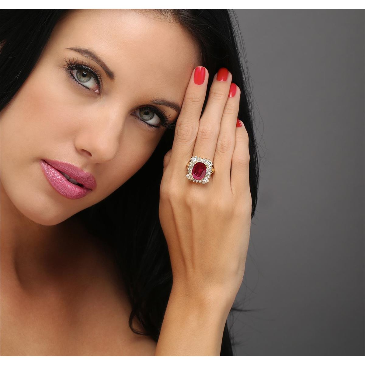 One electronically tested 18KT yellow gold ladies combination cast & assembled ruby and diamond ring with a bright polish finish. Identified with markings of "18K". Condition is new. Containing: One prong set oval modified brilliant cut natural ruby, measuring 13.43 x 10.02 x 3.20mm, approximate weight of 3.62ct., clarity is heavily included, type II, medium, moderately strong, strongly purplish red color, (GIA stpR 5/4), cut is good. Twenty-Four prong set round brilliant cut diamonds, measuring 2.00 - 2.00 x 1.20mm (depth est.) approximate total weight of 24 Stones = 0.70ct. Clarity: SI-1. Color: K - L, Cut is Good. Twelve prong set baguette cut diamonds, measuring 4.50 x 1.50 x 1.28mm (depth est.) approximate total weight of 12 Stones = 0.95ct. Clarity: VS-2. Color: I - J, Cut is Good. Colored gemstones are presumed to have been subjected to commonly used enhancement processes. All diamonds and colored gemstones are graded in the mounting, unless otherwise stated. Total Weight of Colored Stones 3.62ct. Total Weight of Diamonds 1.65ct. Total Weight of Ring 12.00 grams. GGL Appraised at $7,745.00.