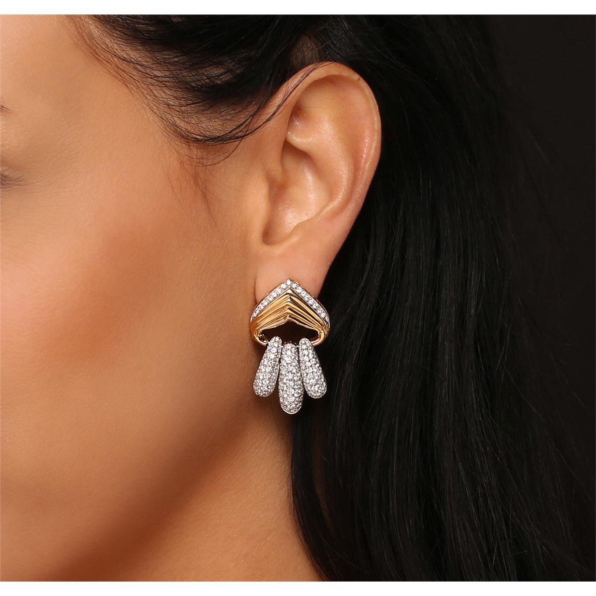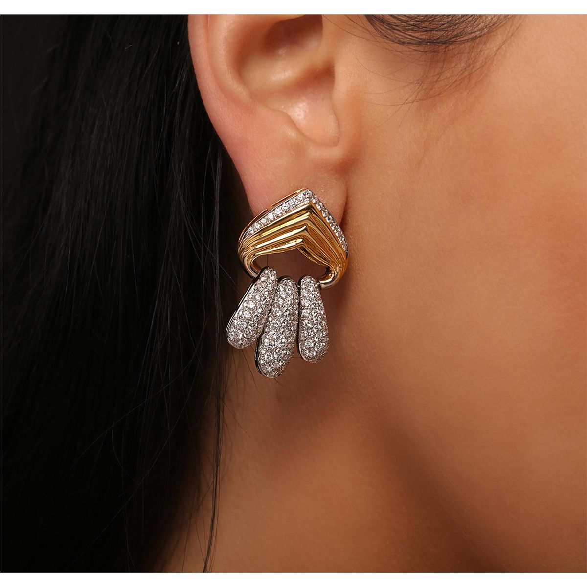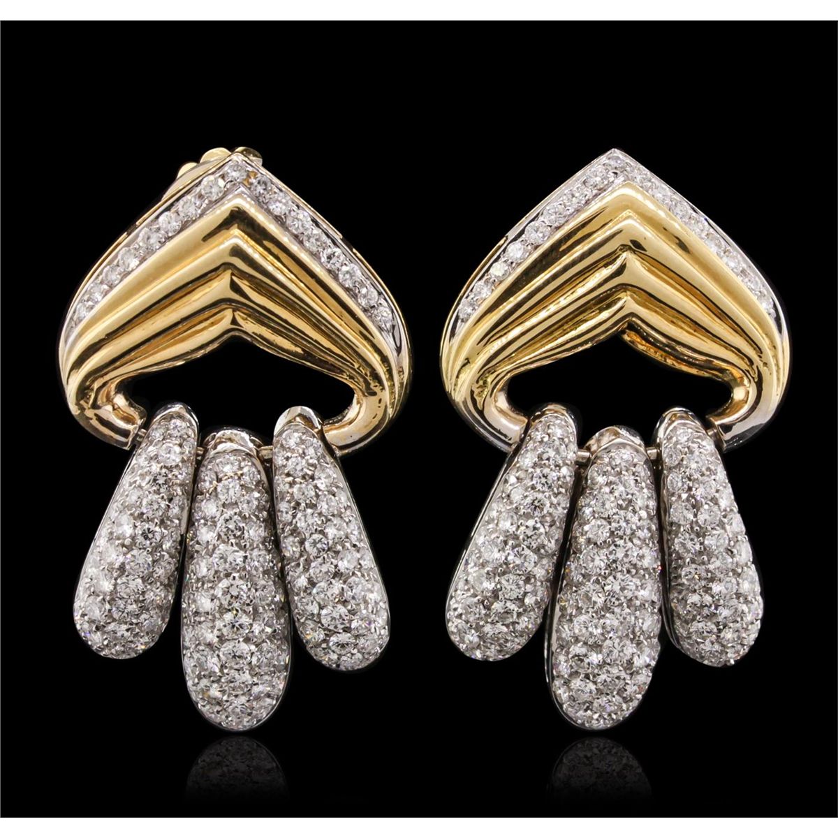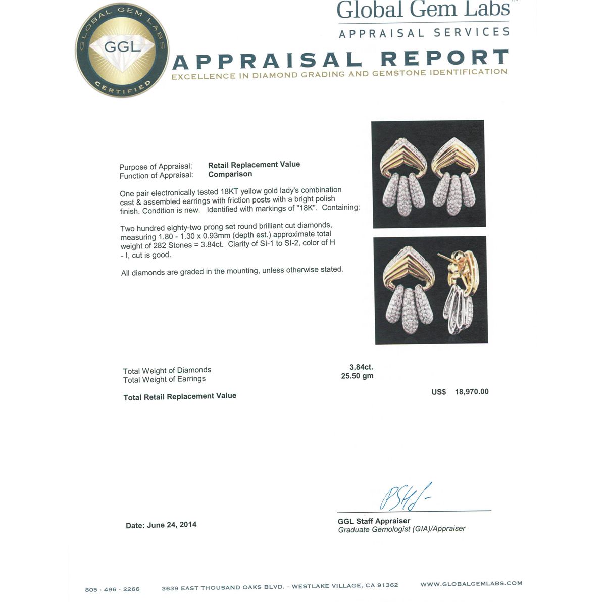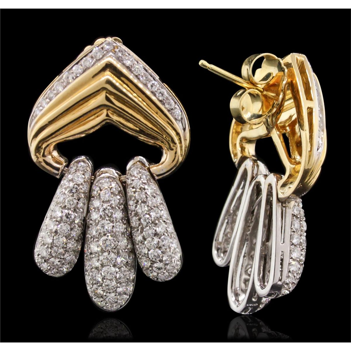 One pair electronically tested 18KT yellow gold Ladies combination cast & assembled earrings with friction posts with a bright polish finish. Condition is new. Identified with markings of "18K". Containing: Two Hundred Eighty-Two prong set round brilliant cut diamonds, measuring 1.80 - 1.30 x 0.93mm (depth est.) approximate. Total Weight of 282 Stones = 3.84ct. Clarity: SI-1 to SI-2. Color: H - I, Cut is Good. All diamonds are graded in the mounting, unless otherwise stated. Total Weight of Diamonds 3.84ct. Total Weight of Earrings 25.50 grams. GGL Appraised at $18,970.00.