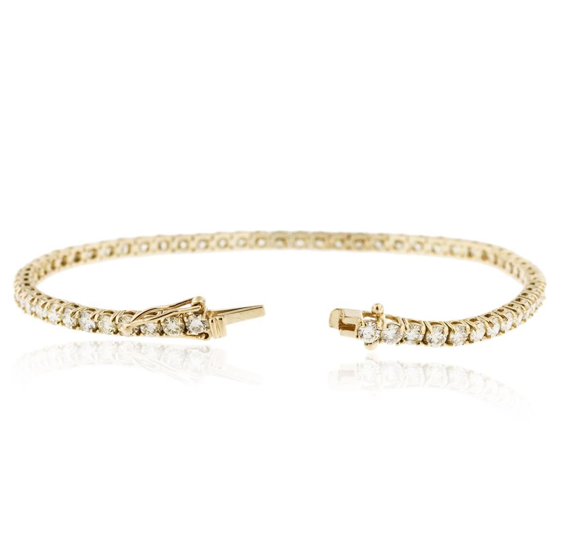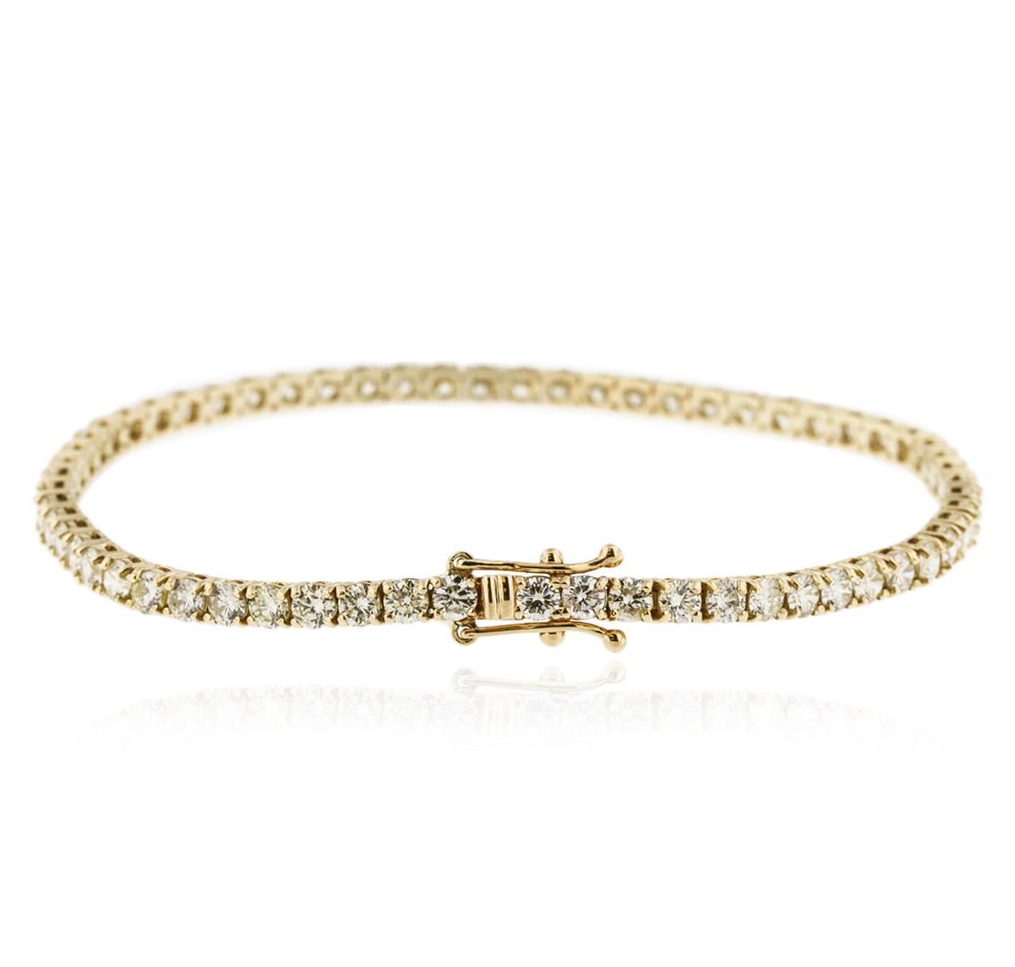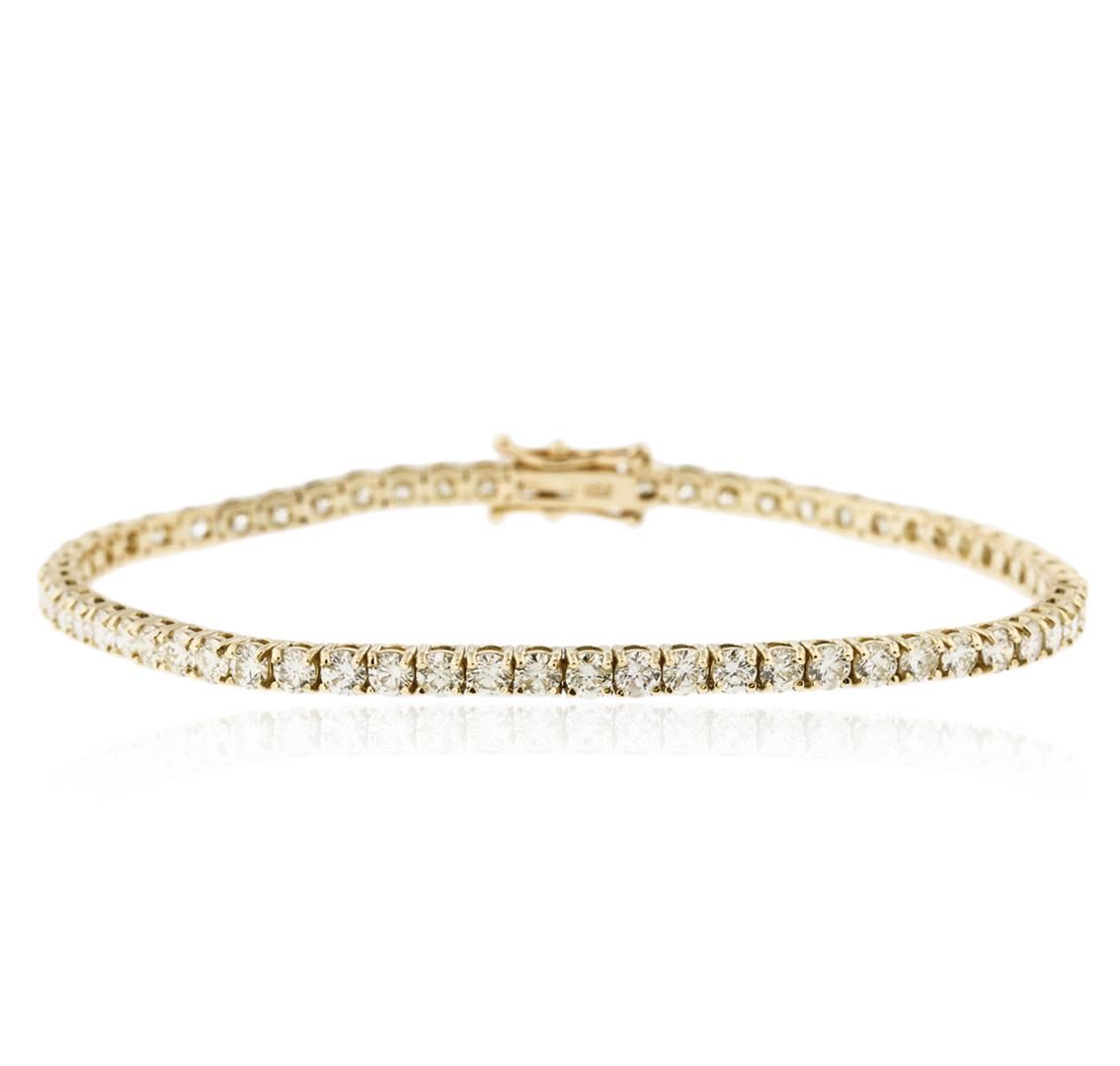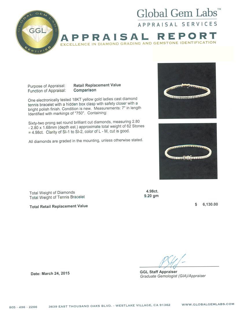 One electronically tested 18KT yellow gold ladies cast diamond tennis bracelet with a hidden box clasp with safety closer with a bright polish finish. Measurements: 7" in length Identified with markings of "750". Condition is new. Containing: Sixty-Two prong set round brilliant cut diamonds, measuring 2.80 - 2.80 x 1.68mm (depth est.) approximate total weight of 62 Stones = 4.98ct. Clarity: SI-1 to SI-2. Color: L - M, Cut is Good. All diamonds are graded in the mounting, unless otherwise stated. Total Weight of Diamonds 4.98ct. Total Weight of Tennis Bracelet 9.20 grams. GGL Appraised at $6,130.00.