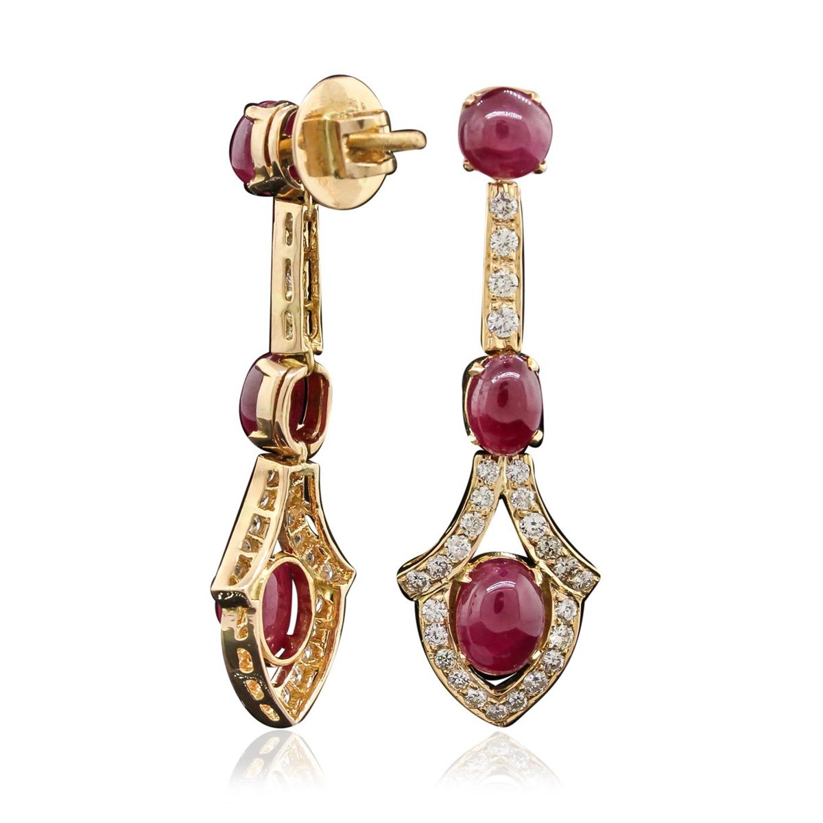 One electronically tested 18KT yellow gold ladies cast & assembled ruby and diamond suite. Condition is good. The suite features a necklace and a pair of earrings. The fourteen and one-half inch length necklace features a semi-rigid ruby and diamond curvature supported by a stylized link chain, terminating in a concealed clasp with safety. The suite is completed by a matching pair of ruby and diamond dangle earrings with screw backs. Bright polish finish. Containing: One prong set oval cabochon cut natural ruby, measuring 10.30 x 8.20 x 7.30mm, 6%. bulge factor, approximate weight of 7.06ct., clarity is severely included, type II, medium dark, very slightly brownish, slightly purplish red color, (GIA slpR 6/3), cut is good. Transmitting light very diffusely, opaque. Naturally occurring internal & external characteristics are present. Graded in the setting. Five prong set oval cabochon cut natural rubies, measuring 9.00 x 7.00 x 5.50mm, approximate. Total Weight of 18.80ct., clarity is severely included, type II, medium dark, very slightly brownish, slightly purplish red color, (GIA slpR 6/3), cut is good. Transmitting light very diffusely, opaque. Naturally occurring internal & external characteristics are present. Measurements & the color grade are an average for the group. Graded in the setting. Six prong set oval cabochon cut natural rubies, measuring 8.00 x 5.80 x 4.00mm, approximate. Total Weight of 12.10ct., clarity is severely included, type II, medium dark, very slightly brownish, slightly purplish red color, (GIA slpR 6/3), cut is good. Transmitting light very diffusely, opaque. Naturally occurring internal & external characteristics are present. Measurements & the color grade are an average for the group. Graded in the setting. Five prong set oval cabochon cut natural rubies, measuring 6.80 x 5.00 x 3.30mm, approximate. Total Weight of 6.15ct., clarity is severely included, type II, medium dark, very slightly brownish, slightly purplish red color, (GIA slpR 6/3), cut is good. Transmitting light very diffusely, opaque. Naturally occurring internal & external characteristics are present. Measurements & the color grade are an average for the group. Graded in the setting. Two prong set round cabochon cut natural rubies, measuring 6.00 x 6.00 x 4.00mm, approximate. Total Weight of 3.22ct., clarity is severely included, type II, medium dark, very slightly brownish, slightly purplish red color, (GIA slpR 6/3), cut is good. Transmitting light very diffusely, opaque. Naturally occurring internal & external characteristics are present. Color grade is an average for the group. Graded in the setting. Two Hundred Seventy bead set round brilliant cut diamonds, measuring 1.90 - 1.40 x 0.99mm (depth est.) approximate. Total Weight of 270 Stones = 4.52ct. Graded in the setting. Clarity: SI-1 to I-1. Color: H - J. Total Weight of Colored Stones 47.33ct. Total Weight of Diamonds 4.52ct. Total Weight of Suite 47.83 grams. AIG Appraised at $29,415.00.