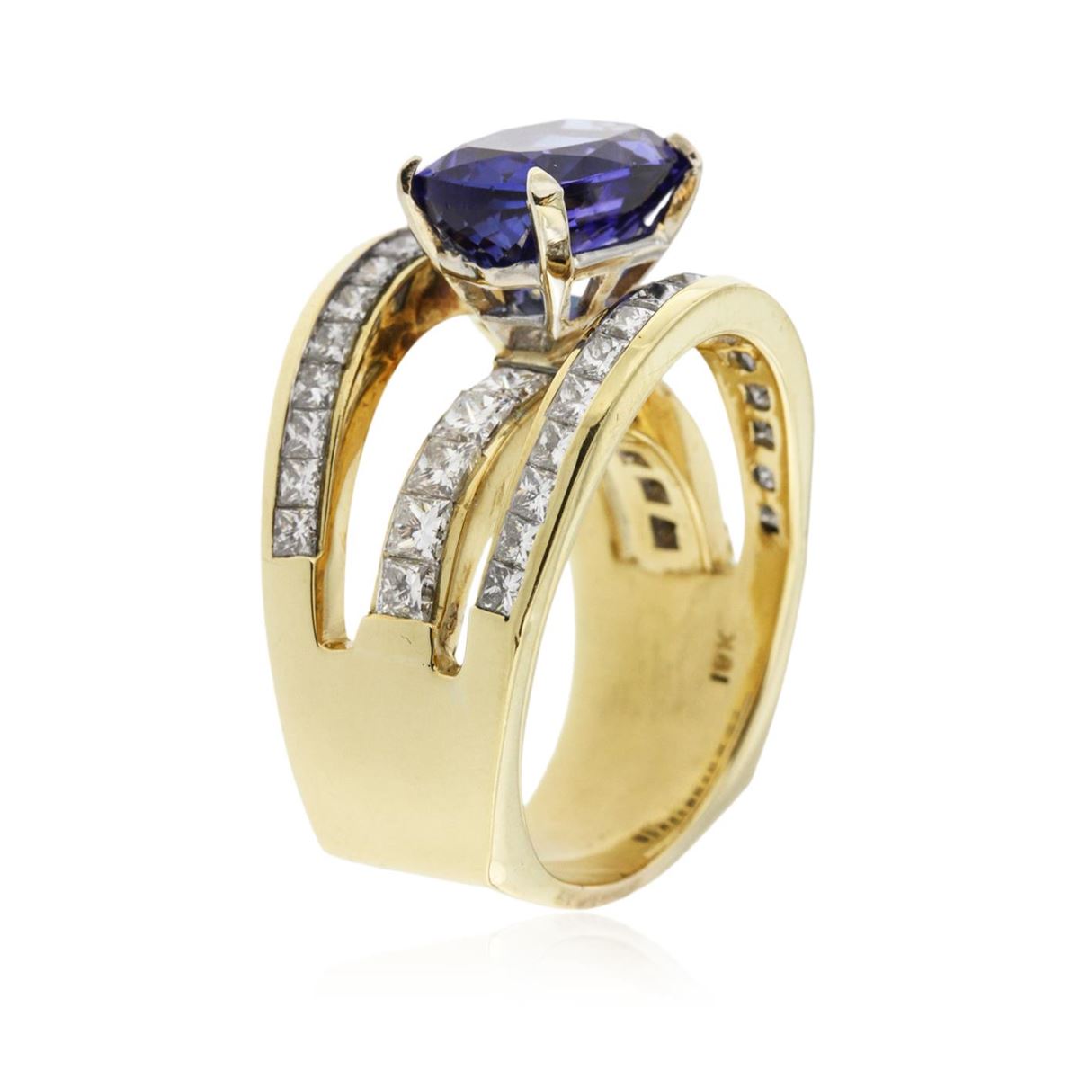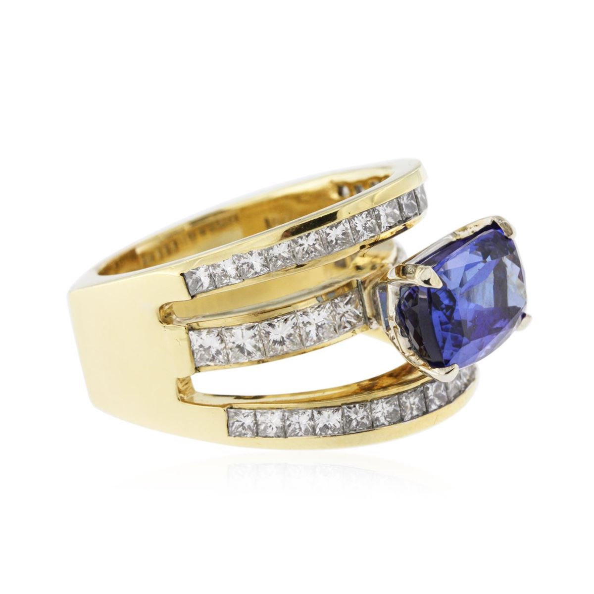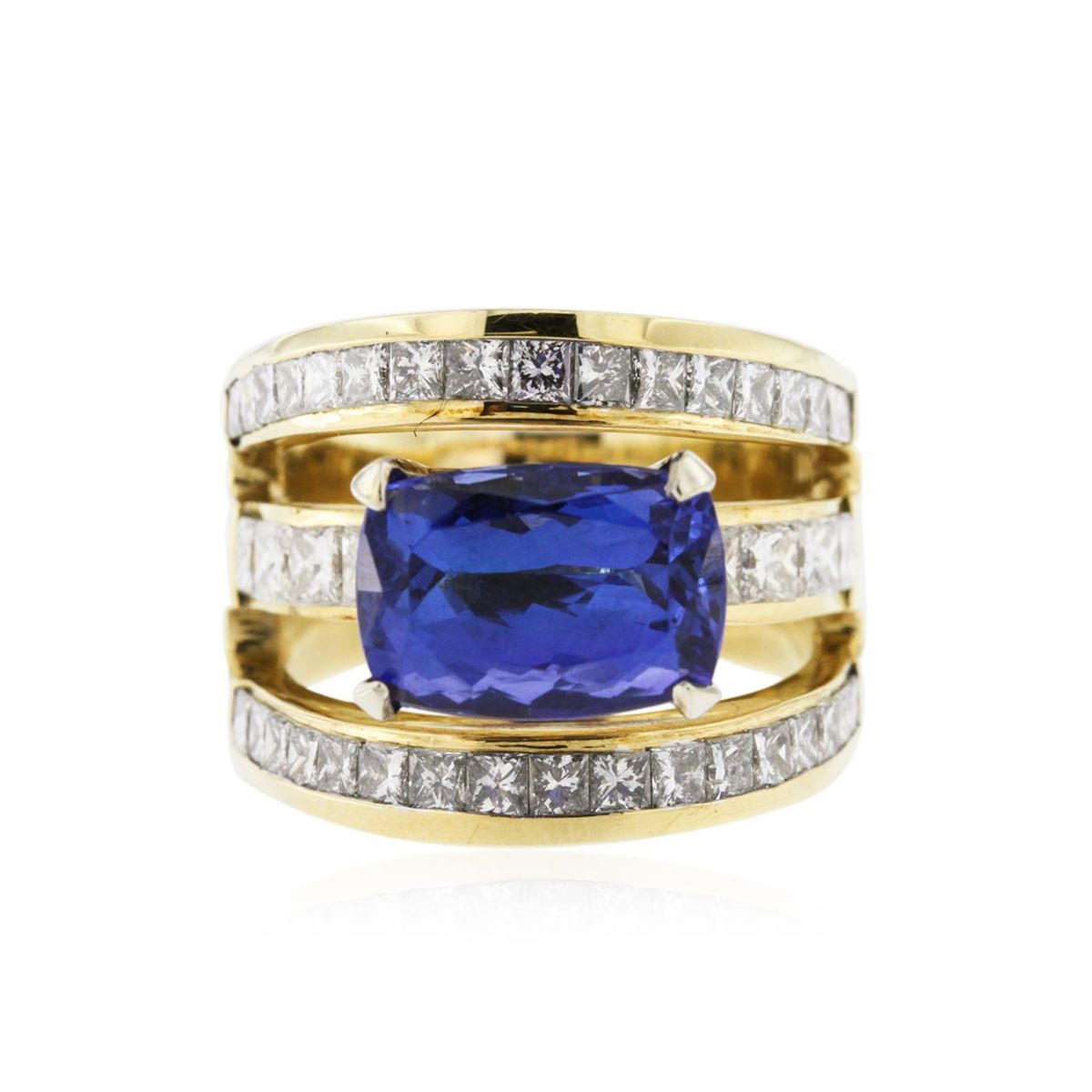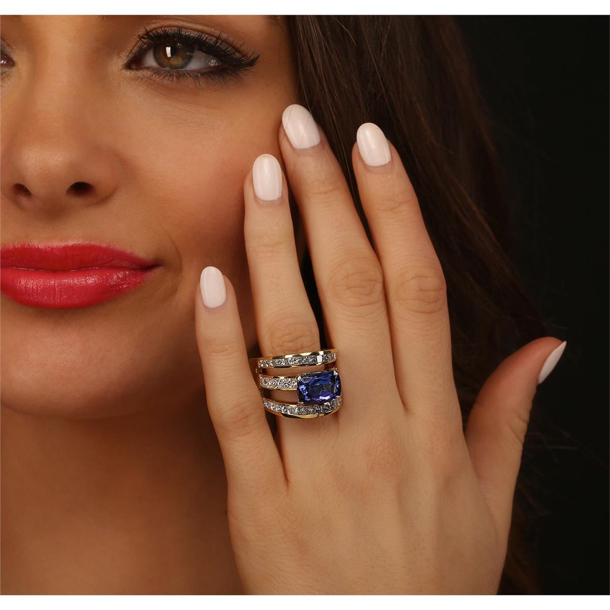 One electronically tested 18KT yellow gold ladies cast tanzanite and diamond ring with a bright polish finish. Condition is new, good workmanship. The featured tanzanite is supported by diamond set shoulders framed by mirroring diamond set orbits, terminating in a squared eight millimeter wide band. Trademark is SA. Identified with markings of "18K". Containing: One prong set rectangular cushion mixed cut natural tanzanite, measuring 12.20 x 8.45 x 6.00mm, 6% bulge factor, approximate weight of 5.16ct, clarity is eye clean, type I, medium dark, moderately strong, violetish blue color, (GIA vB 6/4), cut is good. Transmitting light with no distortion, transparent. Colored Stone Grading Report attached. Graded in the setting. Tanzanite is a very rare gemstone that is only found in the country of Tanzania. Originally discovered in 1967. Tiffany & Company, named the stone Tanzanite. It is found in the Usumburu Mountains that border the Umba Valley of northern Tanzania. Tanzanite occurs in gray, brown, violet, blue, reddish-purple, & green. The gem is interesting because of its exceptional pleochroism. Rotated in different directions a tanzanite will exhibit multiple changes of color. Tanzanite has a low tolerance to ultrasonic cleaning, and should not be cleaned using this method. Ten channel set princess cut diamonds, measuring 2.70 x 2.70 x 2.03mm (depth est.) approximate total weight of 10 Stones = 1.26ct. Measurements are an average for the group. Graded in the setting. Clarity VS-2 to SI-2 Color F-H. Thirty-four channel set princess cut diamonds, measuring 2.10 x 2.10 x 1.58mm (depth est.) approximate total weight of 34 Stones = 2.04ct. Measurements are an average for the group. Graded in the setting. Clarity VS-2 to SI-2. Color F-H. Total Weight of Colored Stones 5.16ct. Total Weight of Diamonds 3.30ct. Total Weight of Ring 23.70 grams. AIG Appraised at $30,850.00.