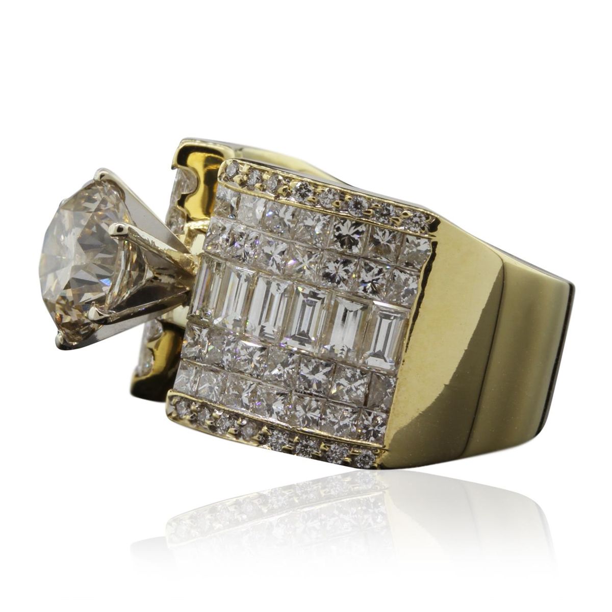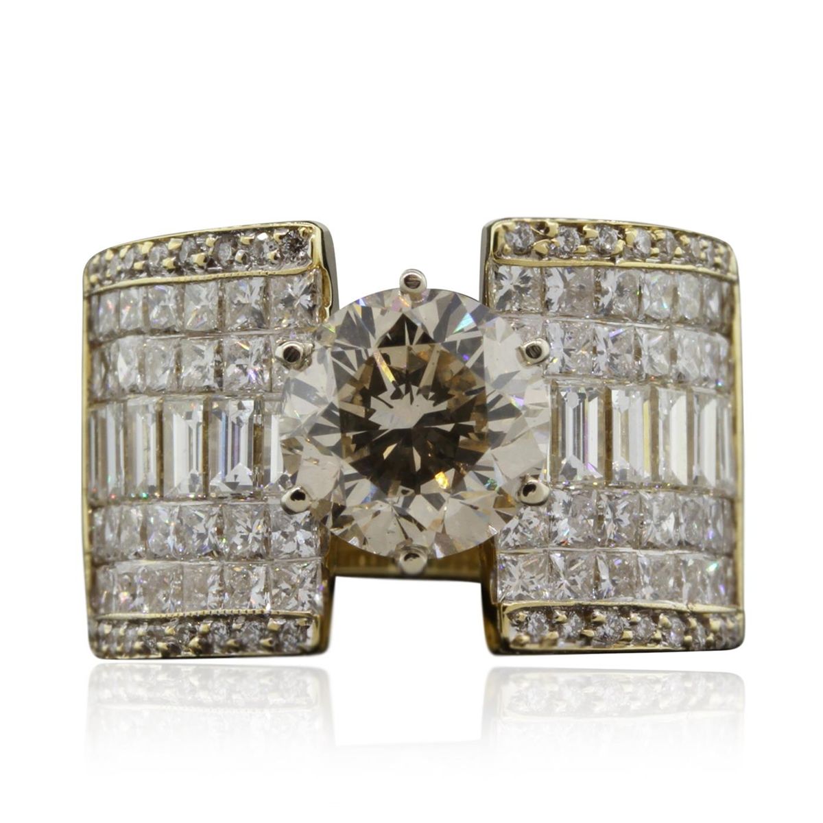 One electronically tested 18KT yellow gold ladies cast & assembled diamond ring with a bright polish finish. Condition is new, good workmanship. The featured diamond is cathedral set supported by elaborate diamond set shoulders, completed by a eight millimeter wide band. Identified with markings of "18K". Containing: One prong set round brilliant cut diamond, measuring 8.65 - 8.60 x 5.30mm (depth est.), 8.00%. GTCF approximate weight of 2.61ct with a medium strong blue fluorescence. Diamond Grading Report attached. Graded in the setting. Clarity: SI-2. Depth: 61.4%. Table 59.1%. Twelve invisible set baguette cut diamonds, measuring 3.50 x 2.10 x 1.47mm (depth est.) approximate. Total Weight of 12 Stones = 1.10ct. Graded in the setting. Clarity: VVS-2 to VS-2. Color: G - I. Fifty-Six invisible set princess cut diamonds, measuring 1.80 x 1.70 x 1.20mm (depth est.) approximate. Total Weight of 56 Stones = 1.73ct. Graded in the setting. Clarity: VS-2 to SI-2. Color: G - I. Thirty-Two bead set round brilliant cut diamonds, measuring 1.10 - 1.00 x 0.63mm (depth est.) approximate. Total Weight of 32 Stones = 0.17ct. Graded in the setting. Clarity: VS-1 to SI-1. Color: G - I. Total Weight of Diamonds 5.61ct. Total Weight of Ring 18.12gm. AIG Appraised at $60,960.00.
