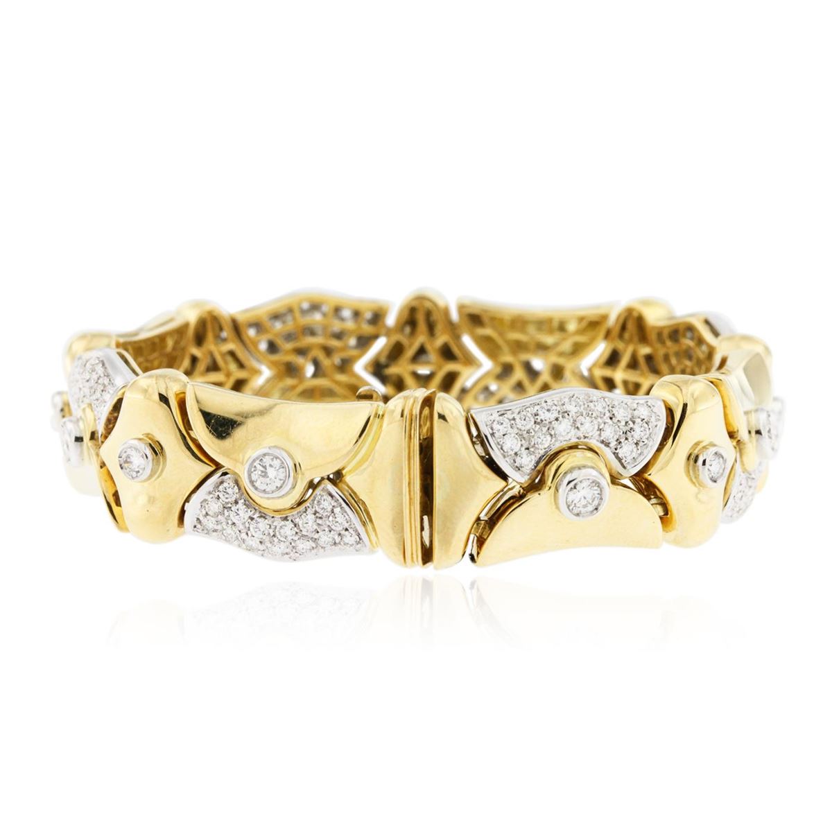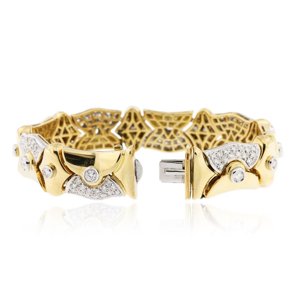 One electronically tested 18KT yellow gold Ladies combination cast & assembled fancy bracelet with a hidden box clasp with a bright polish finish. Identified with markings of "750". Condition is excellent. Containing: One Hundred Twenty-Seven bead set round brilliant cut diamonds, measuring 2.50 - 1.50 x 1.20mm (depth est.) approximate total weight of 127 Stones = 6.55ct. Clarity of VS-1 to VS-2, Color of I - J. Eight bezel set round brilliant cut diamonds, measuring 3.50 - 3.50 x 2.10mm (depth est.) approximate total weight of 8 Stones = 1.25ct. Clarity of VS-1 to VS-2, Color of J - K. Total Weight of Diamonds 7.80ct. Total Weight of Bracelet 57.70gm. GGL Appraised at $39,075.00.