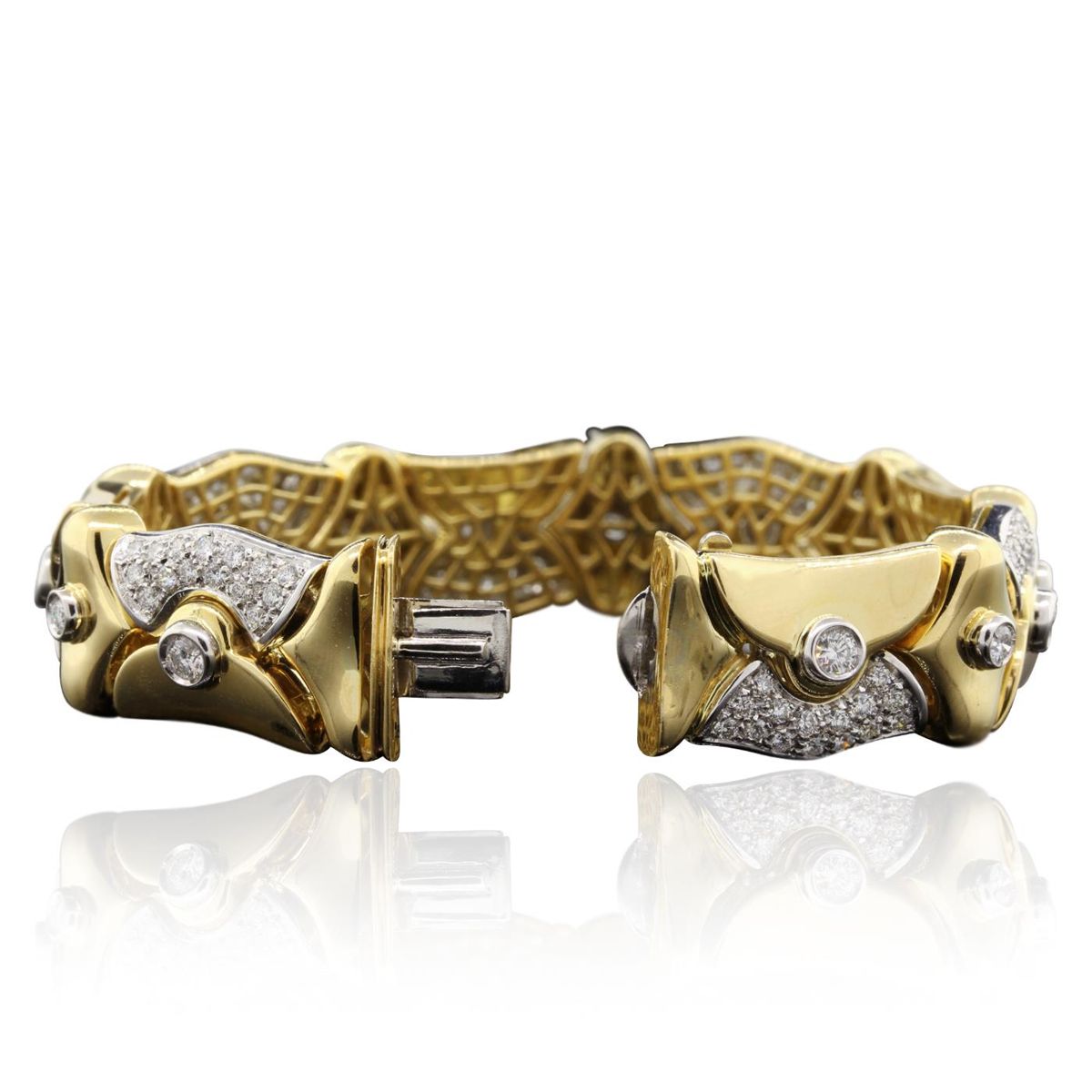 One electronically tested 18KT yellow gold Ladies combination cast & assembled fancy bracelet with a hidden box clasp with a bright polish finish. Identified with markings of "750". Condition is excellent. Containing: One Hundred Twenty-Seven bead set round brilliant cut diamonds, measuring 2.50 - 1.50 x 1.20mm (depth est.) approximate total weight of 127 Stones = 6.55ct. Clarity of VS-1 to VS-2, Color of I - J. Eight bezel set round brilliant cut diamonds, measuring 3.50 - 3.50 x 2.10mm (depth est.) approximate total weight of 8 Stones = 1.25ct. Clarity of VS-1 to VS-2, Color of J - K. Total Weight of Diamonds 7.80ct. Total Weight of Bracelet 57.70gm. GGL Appraised at $39,075.00.