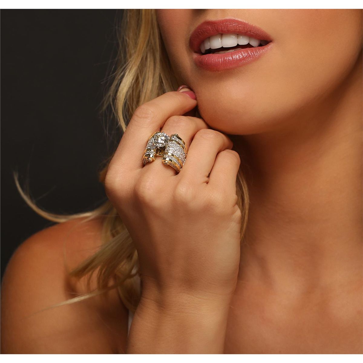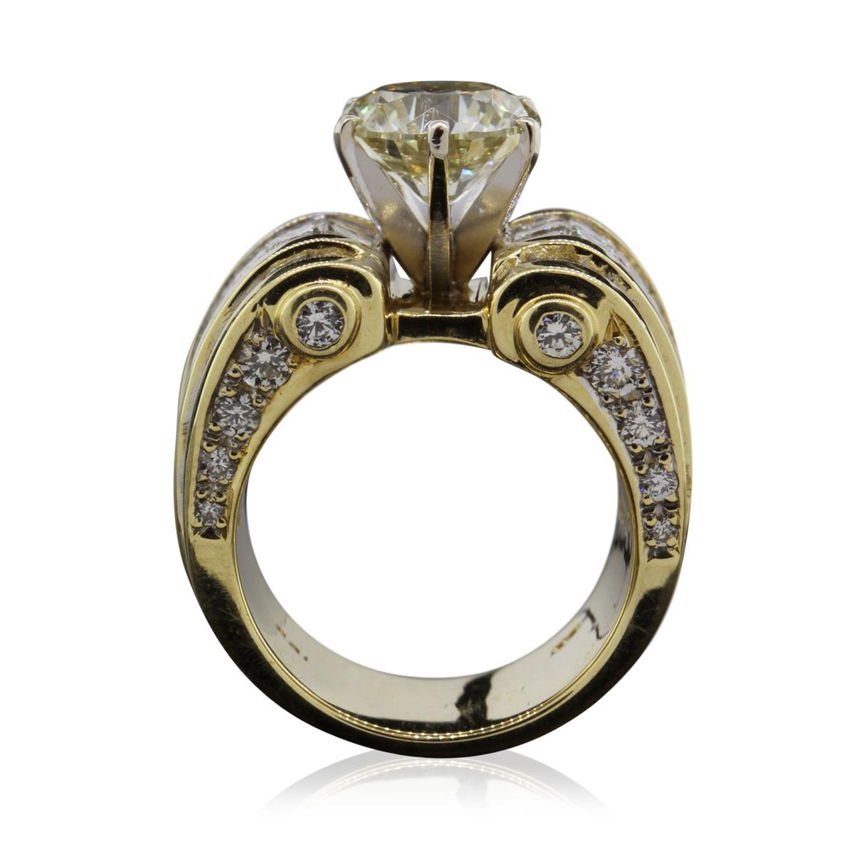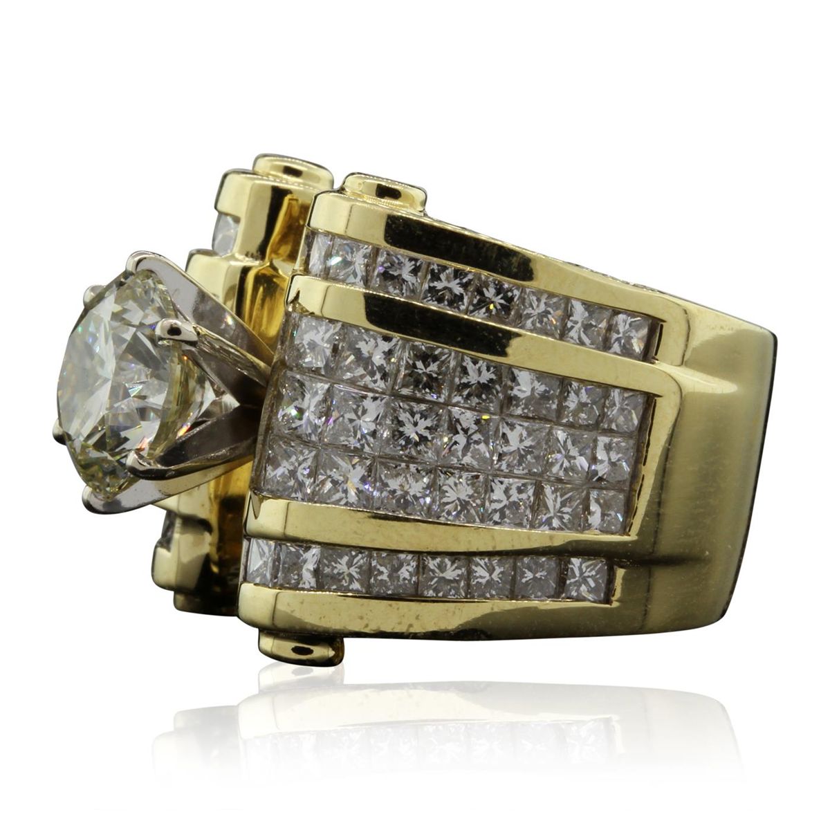 One electronically tested 18KT yellow gold ladies cast & assembled diamond unity ring with a bright polish finish. Condition is good. The featured diamond is cathedral set within diamond set tapering shoulders, completed by an eleven and one-half millimeter wide band. Identified with markings of "18K". Containing: One prong set round brilliant cut diamond, measuring 9.10 - 9.00 x 6.00mm (depth est.) approximate weight of 3.07ct with a medium yellow fluorescence. Diamond Grading Report attached. Graded in the setting. Clarity: SI-2. Depth: 66.3%. Table 58.6%. Eighty invisible and channel set princess cut diamonds, measuring 2.60 x 2.00 x 1.50mm (depth est.) approximate. Total Weight of 80 Stones = 5.25ct. Graded in the setting. Clarity: SI-1 to SI-2. Color: G - I. Twenty bead & bezel set round brilliant cut diamonds, measuring 2.30 - 1.30 x 1.08mm (depth est.) approximate. Total Weight of 20 Stones = 0.49ct. Graded in the setting. Clarity: VS-2 to SI-1. Color: G - I. Total Weight of Diamonds 8.81ct. Total Weight of Ring 33.65gm. AIG Appraised at $81,210.00.