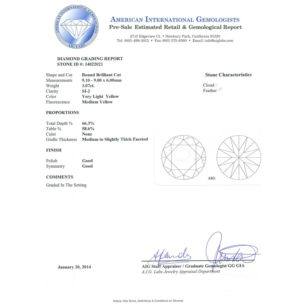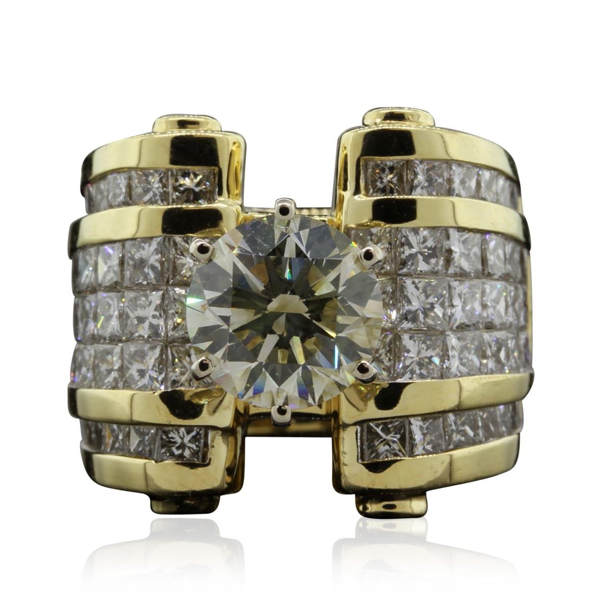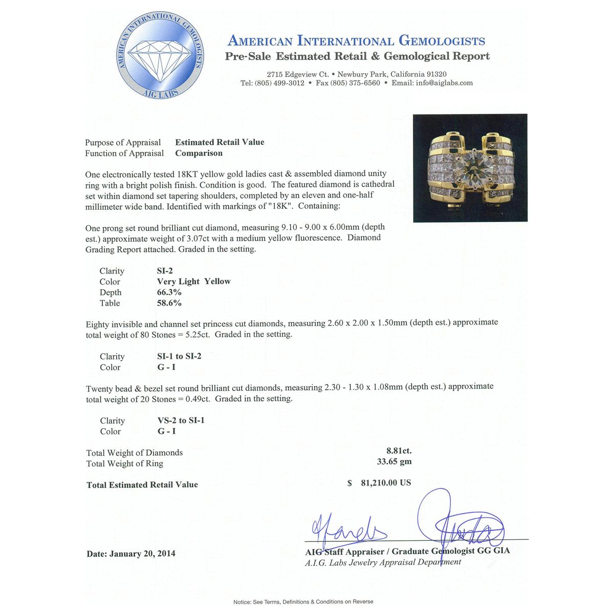 One electronically tested 18KT yellow gold ladies cast & assembled diamond unity ring with a bright polish finish. Condition is good. The featured diamond is cathedral set within diamond set tapering shoulders, completed by an eleven and one-half millimeter wide band. Identified with markings of "18K". Containing: One prong set round brilliant cut diamond, measuring 9.10 - 9.00 x 6.00mm (depth est.) approximate weight of 3.07ct with a medium yellow fluorescence. Diamond Grading Report attached. Graded in the setting. Clarity: SI-2. Depth: 66.3%. Table 58.6%. Eighty invisible and channel set princess cut diamonds, measuring 2.60 x 2.00 x 1.50mm (depth est.) approximate. Total Weight of 80 Stones = 5.25ct. Graded in the setting. Clarity: SI-1 to SI-2. Color: G - I. Twenty bead & bezel set round brilliant cut diamonds, measuring 2.30 - 1.30 x 1.08mm (depth est.) approximate. Total Weight of 20 Stones = 0.49ct. Graded in the setting. Clarity: VS-2 to SI-1. Color: G - I. Total Weight of Diamonds 8.81ct. Total Weight of Ring 33.65gm. AIG Appraised at $81,210.00.