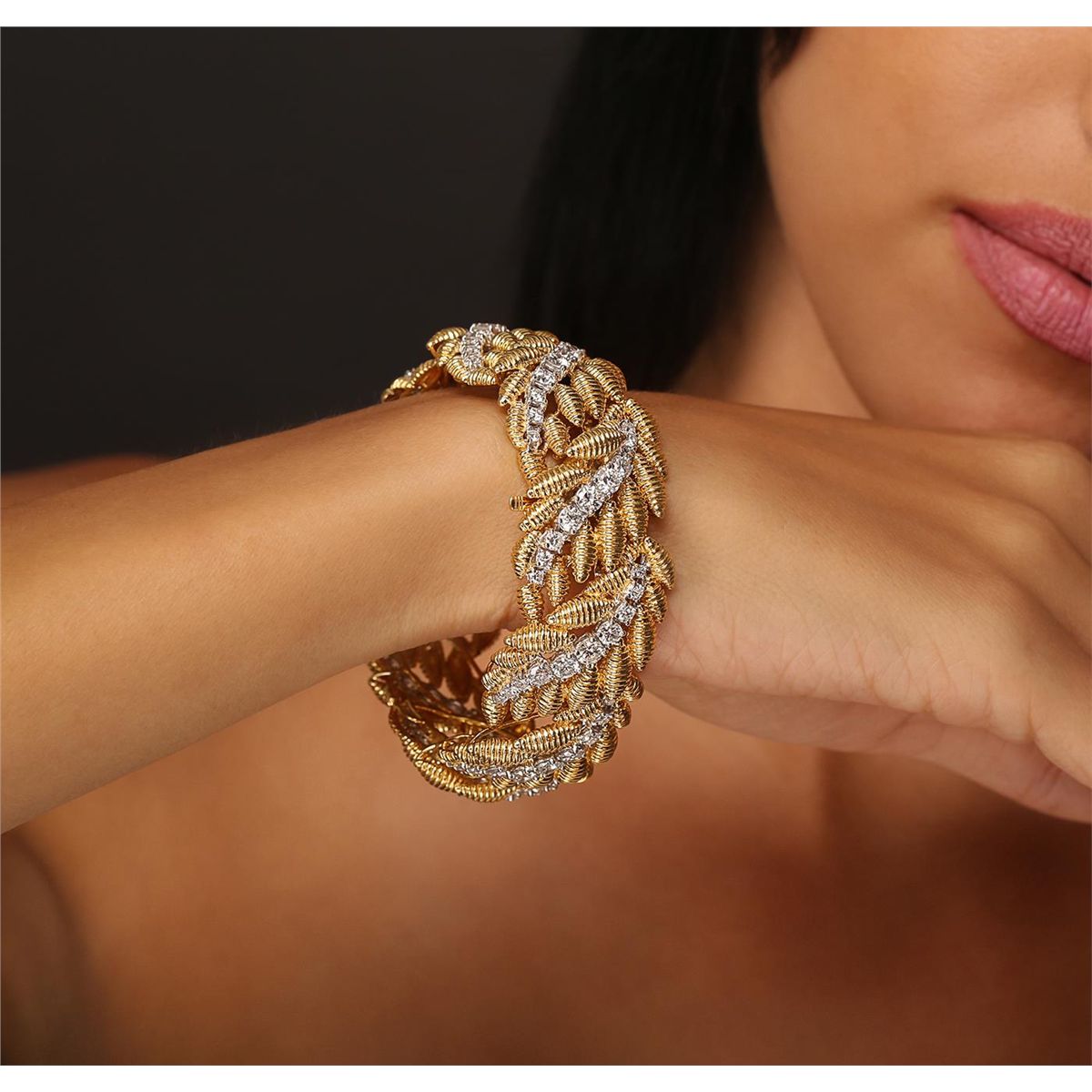 One electronically tested 18KT yellow and white gold Ladies hand fabricated bracelet with a hidden box clasp with a bright polish finish. Measurements: 7.5" in length, 1.0" wide. Identified with markings of "18K". Condition is new. Containing: Thirty-Six prong set round brilliant cut diamonds, measuring 4.00 - 3.50 x 2.25mm (depth est.) approximate. Total Weight of 36 Stones = 6.95ct. Clarity: SI-1 to SI-2. Color: I - J, Cut is Good. Fifty-Four prong set round brilliant cut diamonds, measuring 2.50 - 1.80 x 1.29mm (depth est.) approximate. Total Weight of 54 Stones = 1.96ct. Clarity: SI-1 to SI-2. Color: I - J, Cut is Good. Total Weight of Diamonds 8.91ct. Total Weight of Bracelet 90.20 grams. GGL Appraised at $62,460.00.