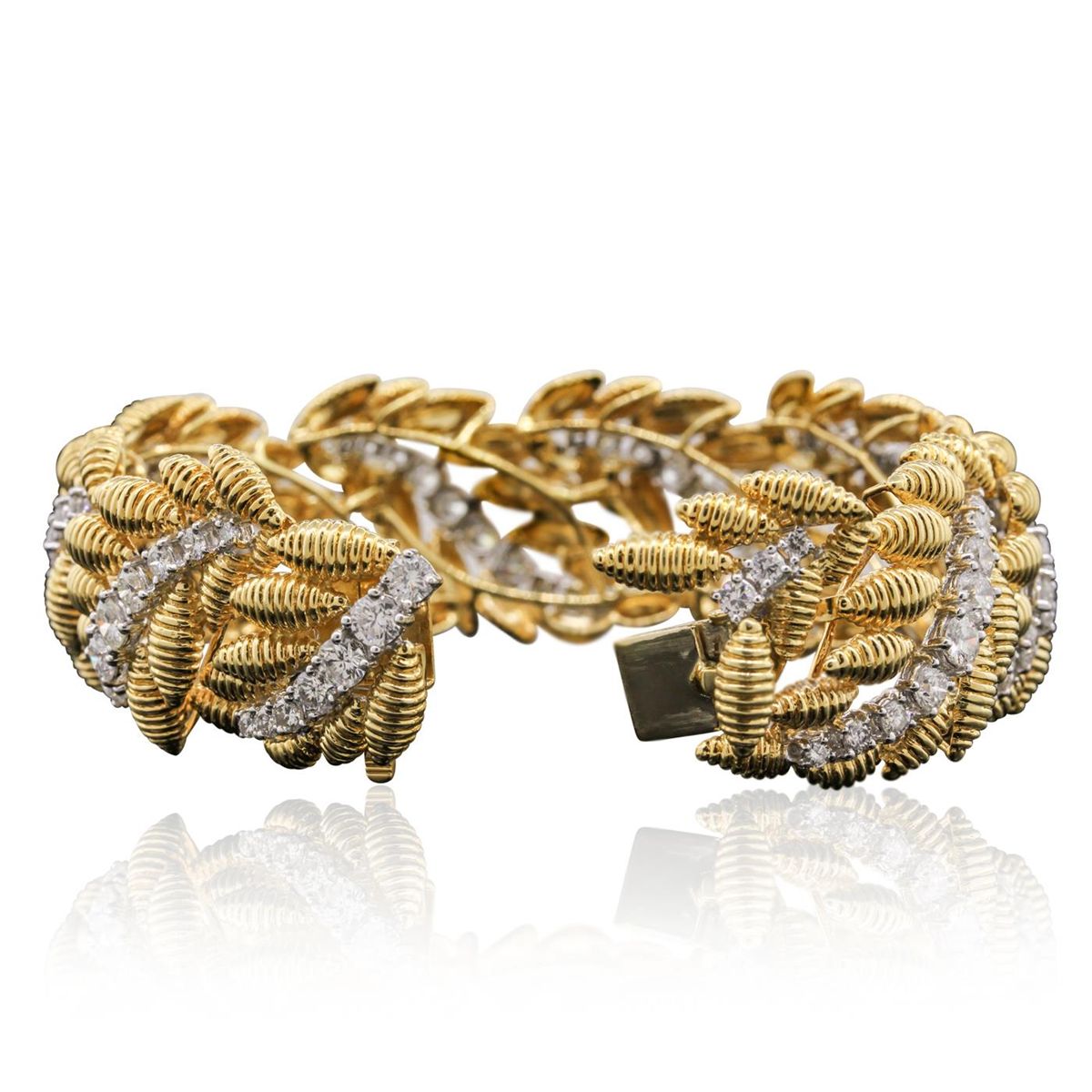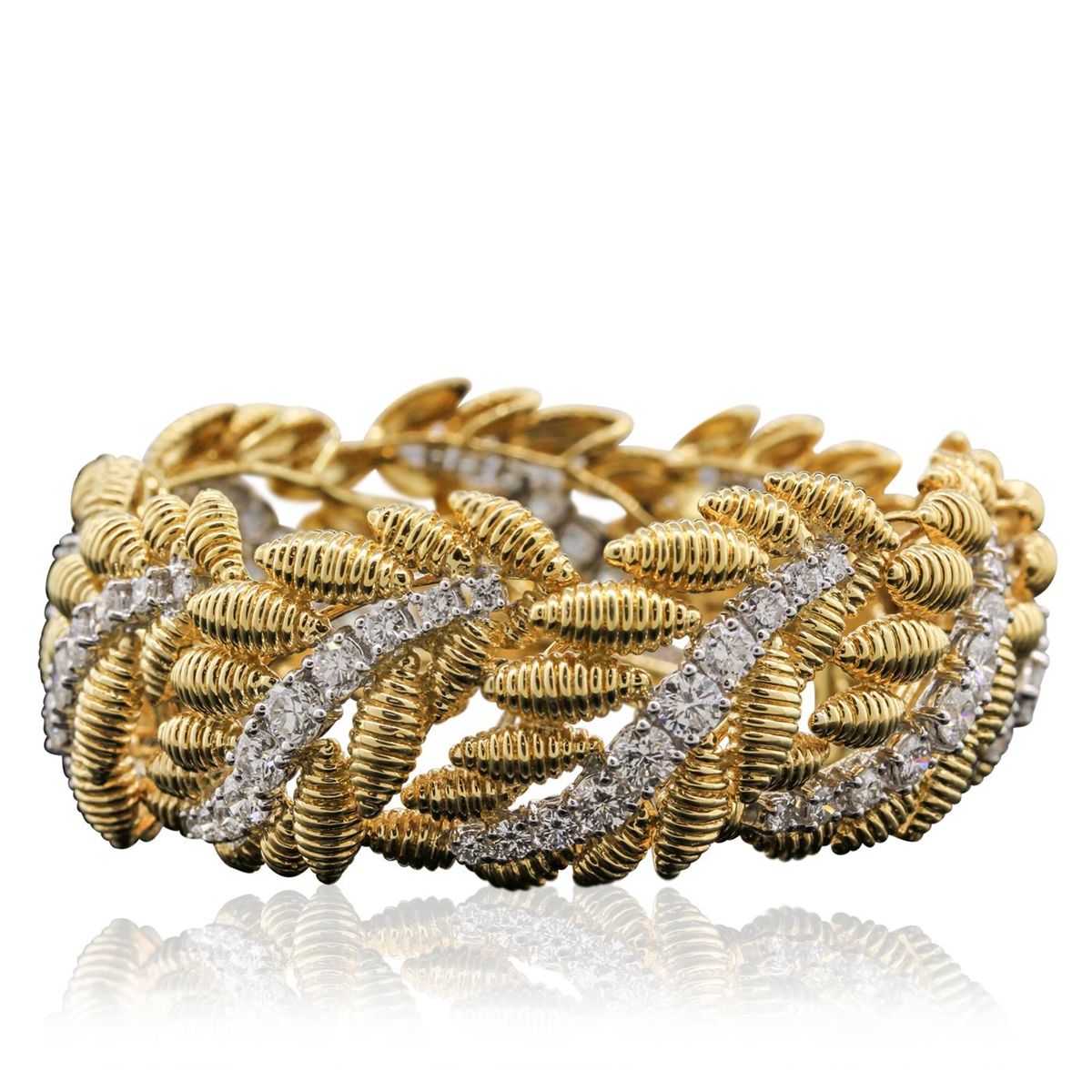 One electronically tested 18KT yellow and white gold Ladies hand fabricated bracelet with a hidden box clasp with a bright polish finish. Measurements: 7.5" in length, 1.0" wide. Identified with markings of "18K". Condition is new. Containing: Thirty-Six prong set round brilliant cut diamonds, measuring 4.00 - 3.50 x 2.25mm (depth est.) approximate. Total Weight of 36 Stones = 6.95ct. Clarity: SI-1 to SI-2. Color: I - J, Cut is Good. Fifty-Four prong set round brilliant cut diamonds, measuring 2.50 - 1.80 x 1.29mm (depth est.) approximate. Total Weight of 54 Stones = 1.96ct. Clarity: SI-1 to SI-2. Color: I - J, Cut is Good. Total Weight of Diamonds 8.91ct. Total Weight of Bracelet 90.20 grams. GGL Appraised at $62,460.00.