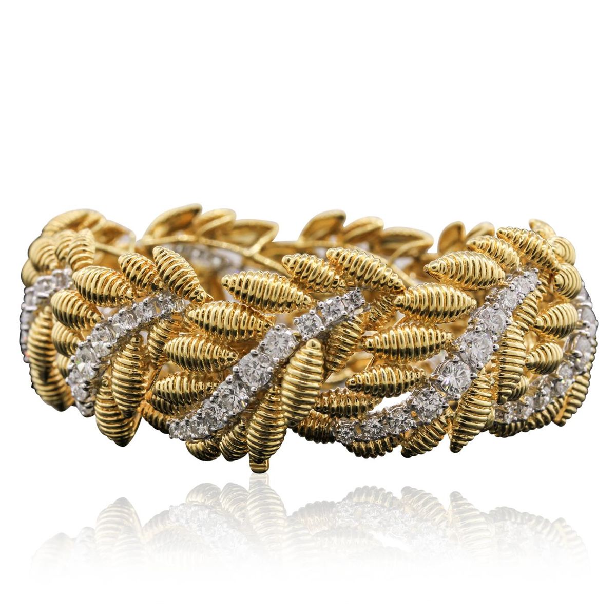 One electronically tested 18KT yellow and white gold Ladies hand fabricated bracelet with a hidden box clasp with a bright polish finish. Measurements: 7.5" in length, 1.0" wide. Identified with markings of "18K". Condition is new. Containing: Thirty-Six prong set round brilliant cut diamonds, measuring 4.00 - 3.50 x 2.25mm (depth est.) approximate. Total Weight of 36 Stones = 6.95ct. Clarity: SI-1 to SI-2. Color: I - J, Cut is Good. Fifty-Four prong set round brilliant cut diamonds, measuring 2.50 - 1.80 x 1.29mm (depth est.) approximate. Total Weight of 54 Stones = 1.96ct. Clarity: SI-1 to SI-2. Color: I - J, Cut is Good. Total Weight of Diamonds 8.91ct. Total Weight of Bracelet 90.20 grams. GGL Appraised at $62,460.00.
