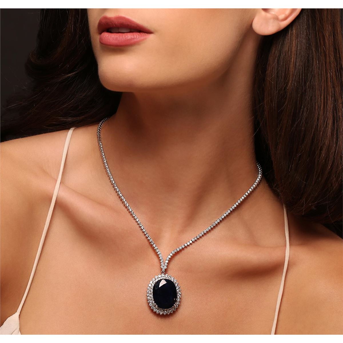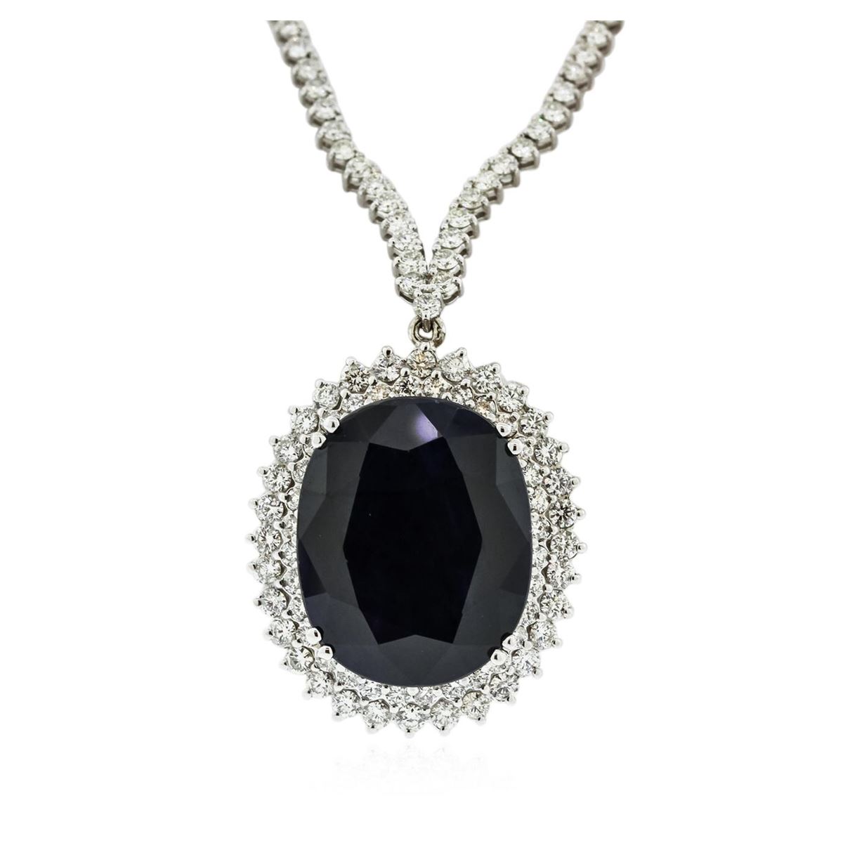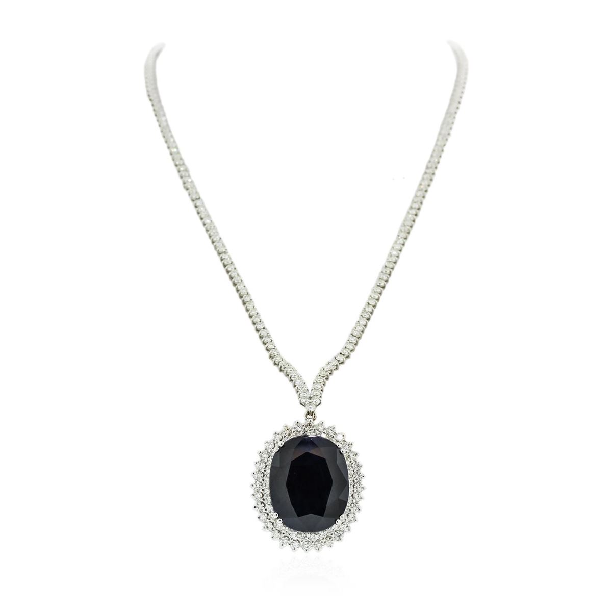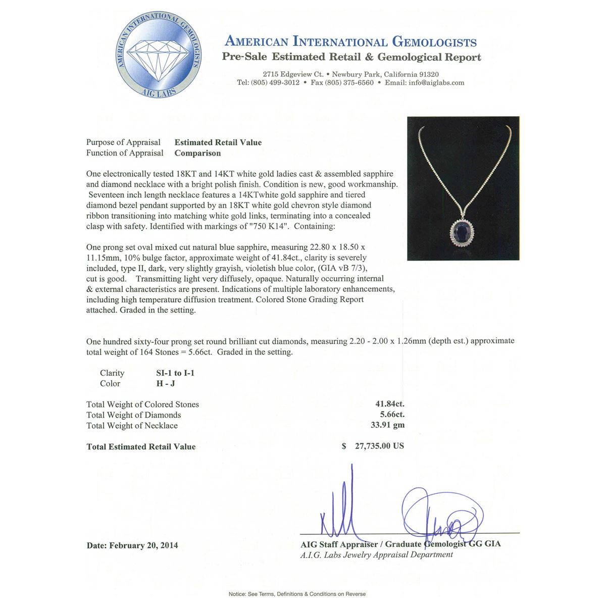 One electronically tested 18KT and 14KT White Gold ladies cast & assembled sapphire and diamond necklace with a bright polish finish. Condition is new, good workmanship. Seventeen inch length necklace features a 14KTWhite Gold sapphire and tiered diamond bezel pendant supported by an 18KT White Gold chevron style diamond ribbon transitioning into matching White Gold links, terminating into a concealed clasp with safety. Identified with markings of "750 K14". Containing: One prong set oval mixed cut natural blue sapphire, measuring 22.80 x 18.50 x 11.15mm, 10%. bulge factor, approximate weight of 41.84ct., clarity is severely included, type II, dark, very slightly grayish, violetish blue color, (GIA vB 7/3), cut is good. Transmitting light very diffusely, opaque. Naturally occurring internal & external characteristics are present. Indications of multiple laboratory enhancements, including high temperature diffusion treatment. Colored Stone Grading Report attached. Graded in the setting. One Hundred Sixty-Four prong set round brilliant cut diamonds, measuring 2.20 - 2.00 x 1.26mm (depth est.) approximate. Total Weight of 164 Stones = 5.66ct. Graded in the setting. Clarity: SI-1 to I-1. Color: H - J. Total Weight of Colored Stones 41.84ct. Total Weight of Diamonds 5.66ct. Total Weight of Necklace 33.91 grams. AIG Appraised at $27,735.00.