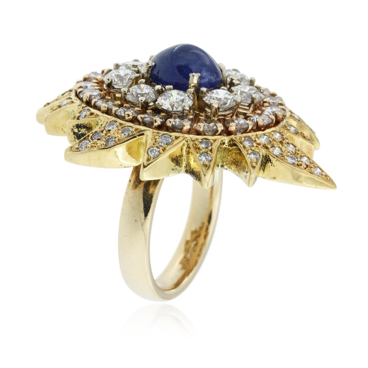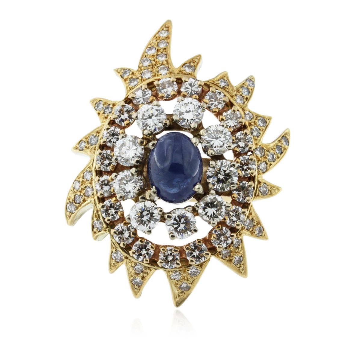 One electronically tested 18KT and 14KT yellow gold ladies cast & assembled sapphire and diamond ring with a bright polish finish. Condition is new, good workmanship. The featured sapphire is set within an 18KT yellow gold diamond set stylized sunburst, completed by a 14KT yellow gold three and one-half millimeter wide band. Containing: One prong set oval cabochon cut natural blue sapphire, measuring 9.00 x 7.00 x 4.55mm, approximate weight of 3.20ct., clarity is moderately included, type II, medium, moderately strong, violetish blue color, (GIA vB 5/4), cut is good. Transmitting light somewhat diffusely, transparent to translucent. Naturally occurring internal & external characteristics are present. Refractive index testing results of 1.76 to 1.77. This is a conclusive result for corundum (sapphire). Nine prong set round brilliant cut diamonds, measuring 3.90 - 3.70 x 2.28mm (depth est.) approximate total weight of 9 Stones = 1.90ct. Graded in the setting. Clarity SI-1 to SI-2 Color G - I. Nineteen prong set round brilliant cut diamonds, measuring 2.80 - 2.70 x 1.65mm (depth est.) approximate total weight of 19 Stones = 1.55ct. Graded in the setting. Clarity VS-2 to SI-2 Color G - I. Forty-Four bead set round brilliant cut diamonds, measuring 1.60 - 1.50 x 0.93mm (depth est.) approximate total weight of 44 Stones = 0.68ct. Graded in the setting. Clarity VVS-2 to VS-2. Color G - I. Total Weight of Colored Stones 3.20 ct. Total Weight of Diamonds 4.13 ct. Total Weight of Ring 19.18 grams. AIG Appraised at $23,190.00.