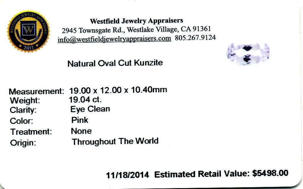 19.04ctw. Natural Oval Cut Kunzite. Westfield Appraised at $5,498.00.