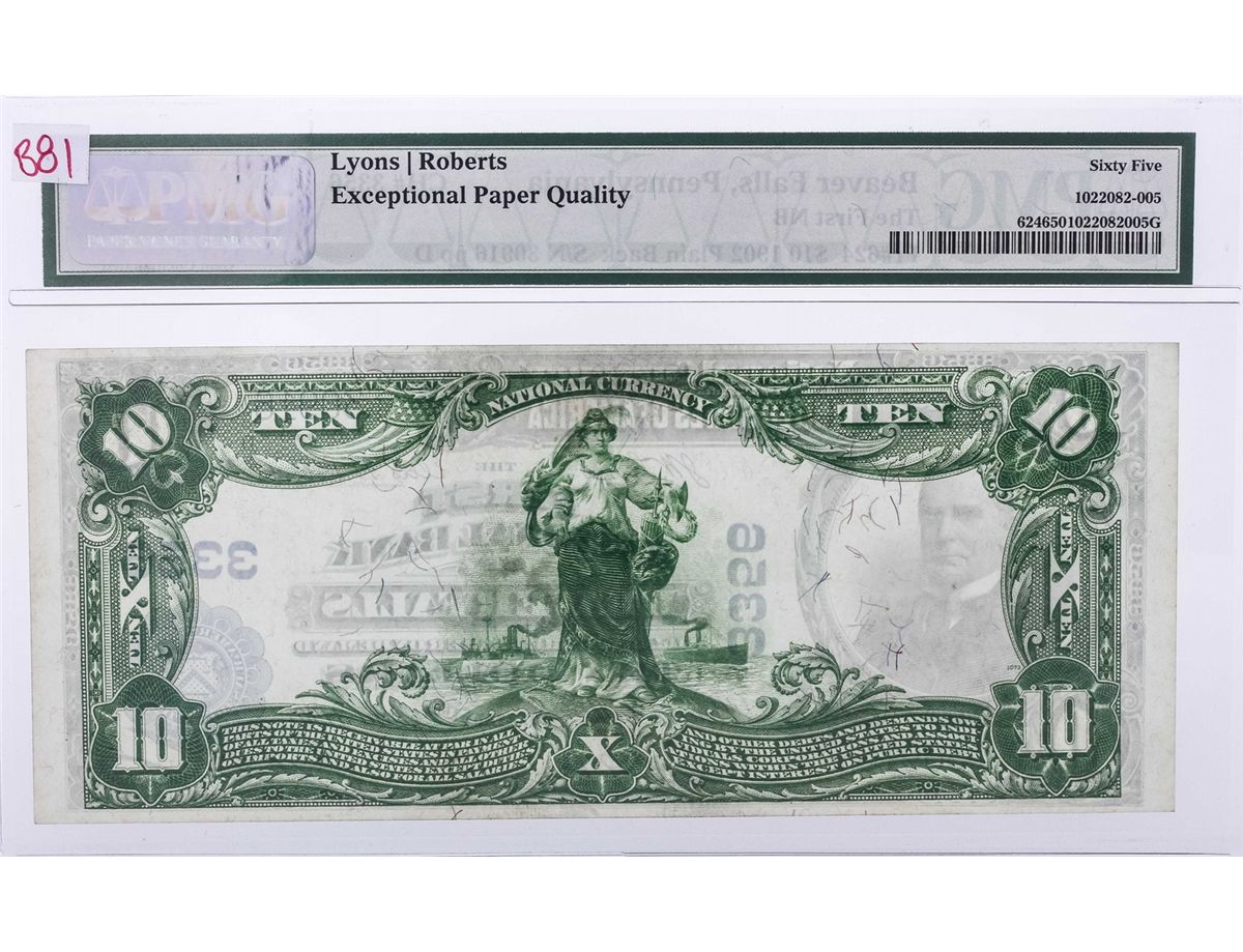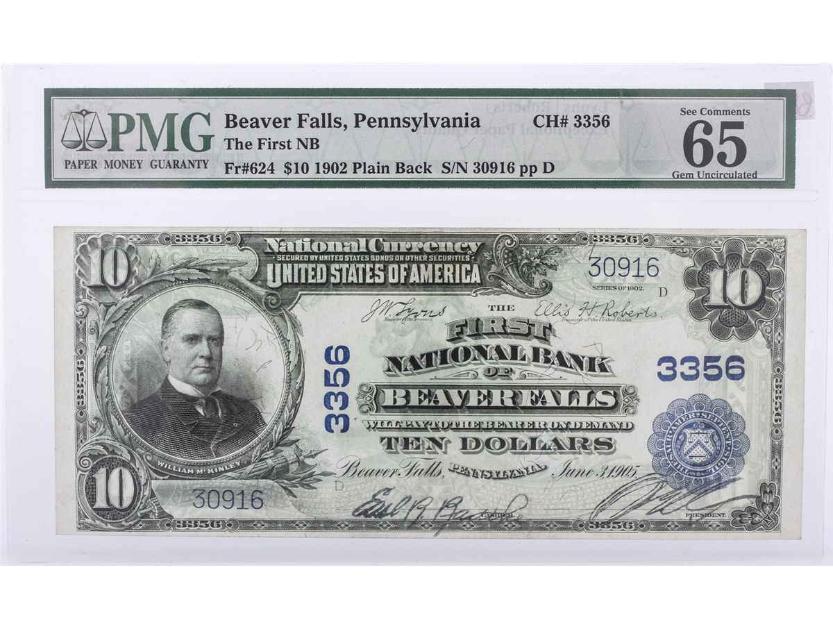 One 1902 $10 Plain Back Pennsylvania Beaver Creek National Currency "FINEST KNOWN" PMG65 .
