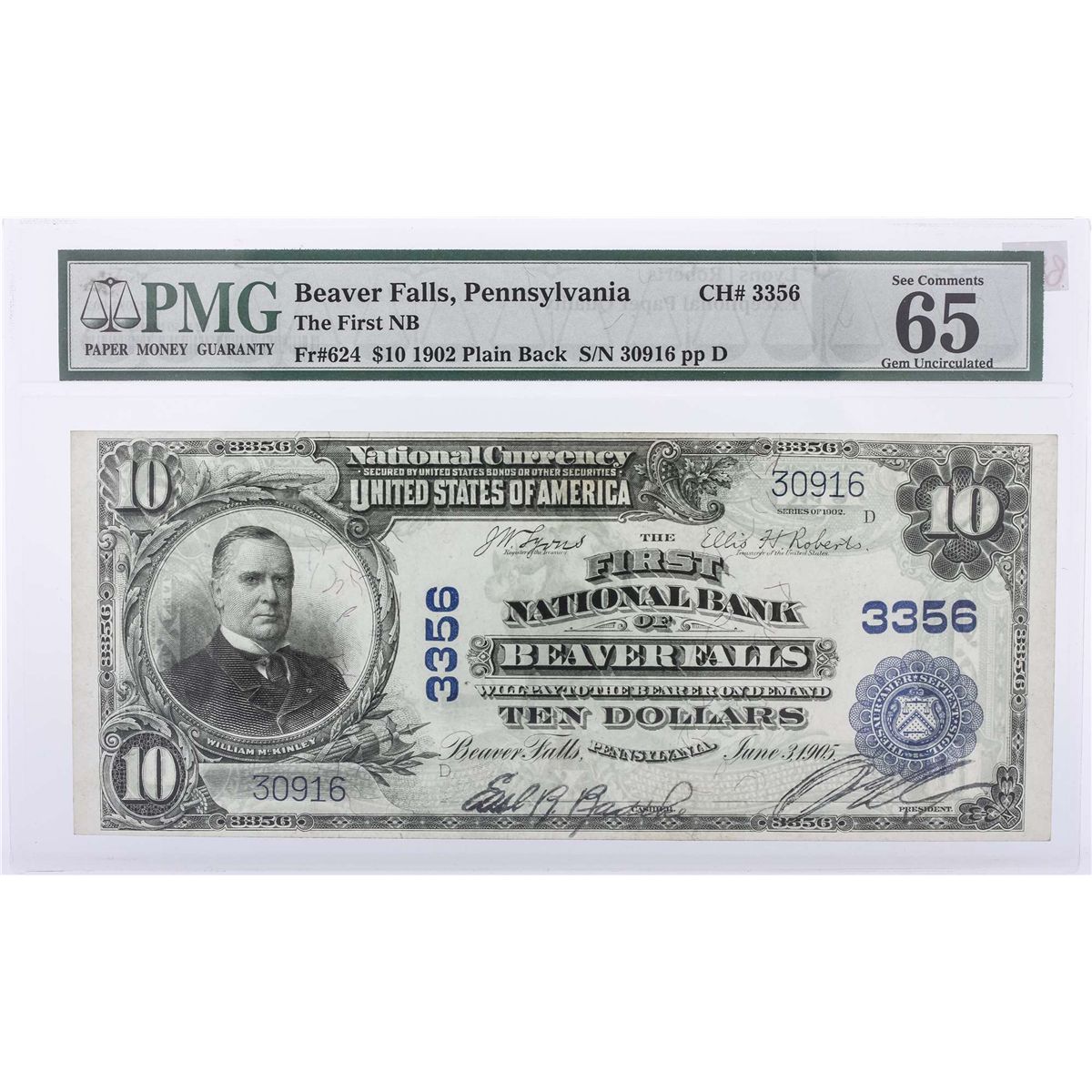 One 1902 $10 Plain Back Pennsylvania Beaver Creek National Currency "FINEST KNOWN" PMG65 .
