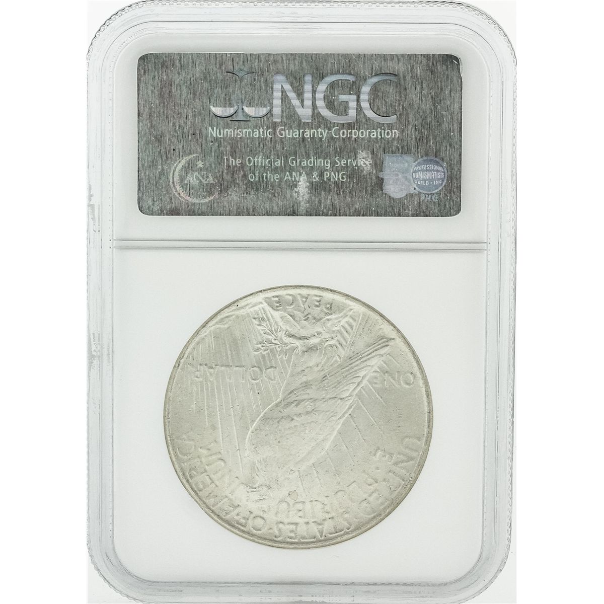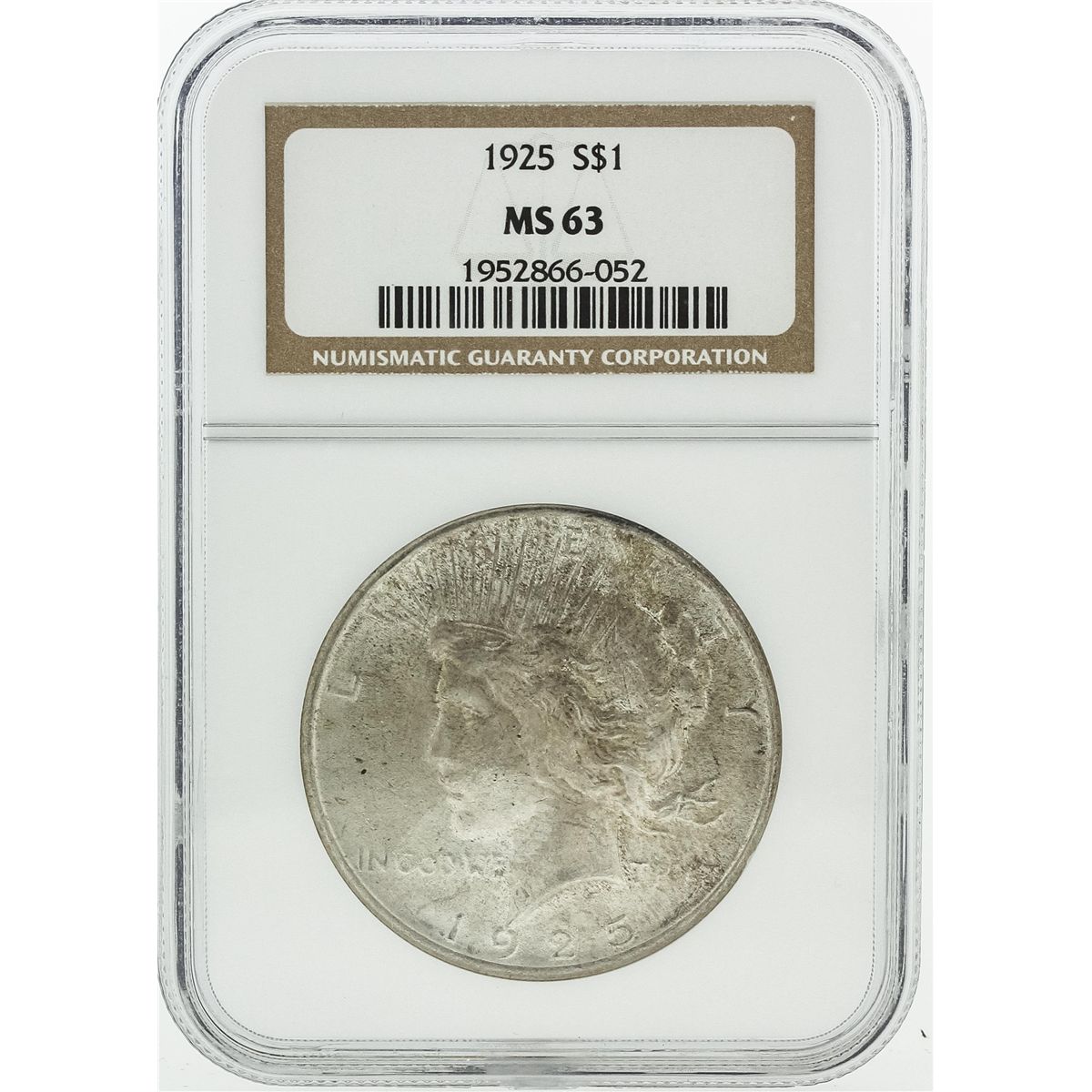 One 1925 NGC MS63 Peace Silver Dollar Coin.
