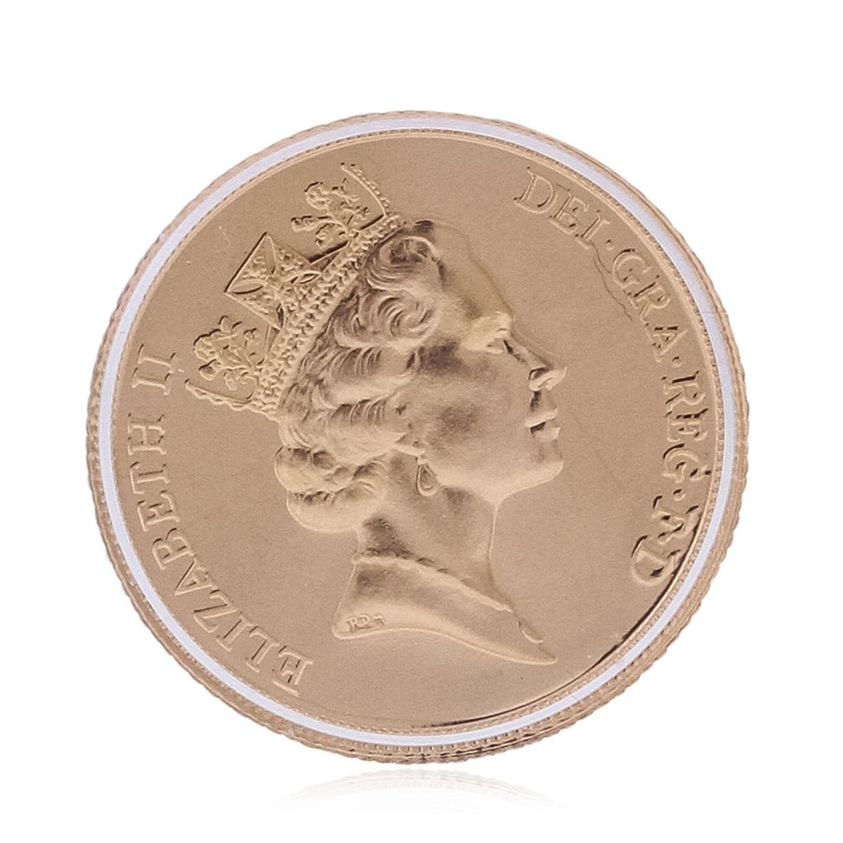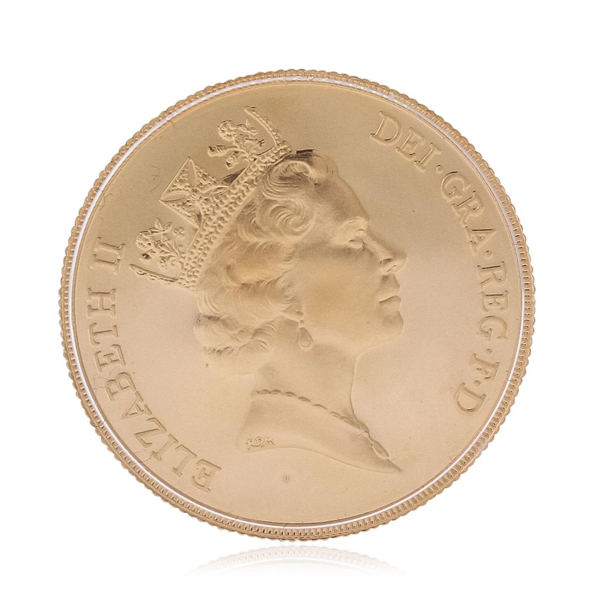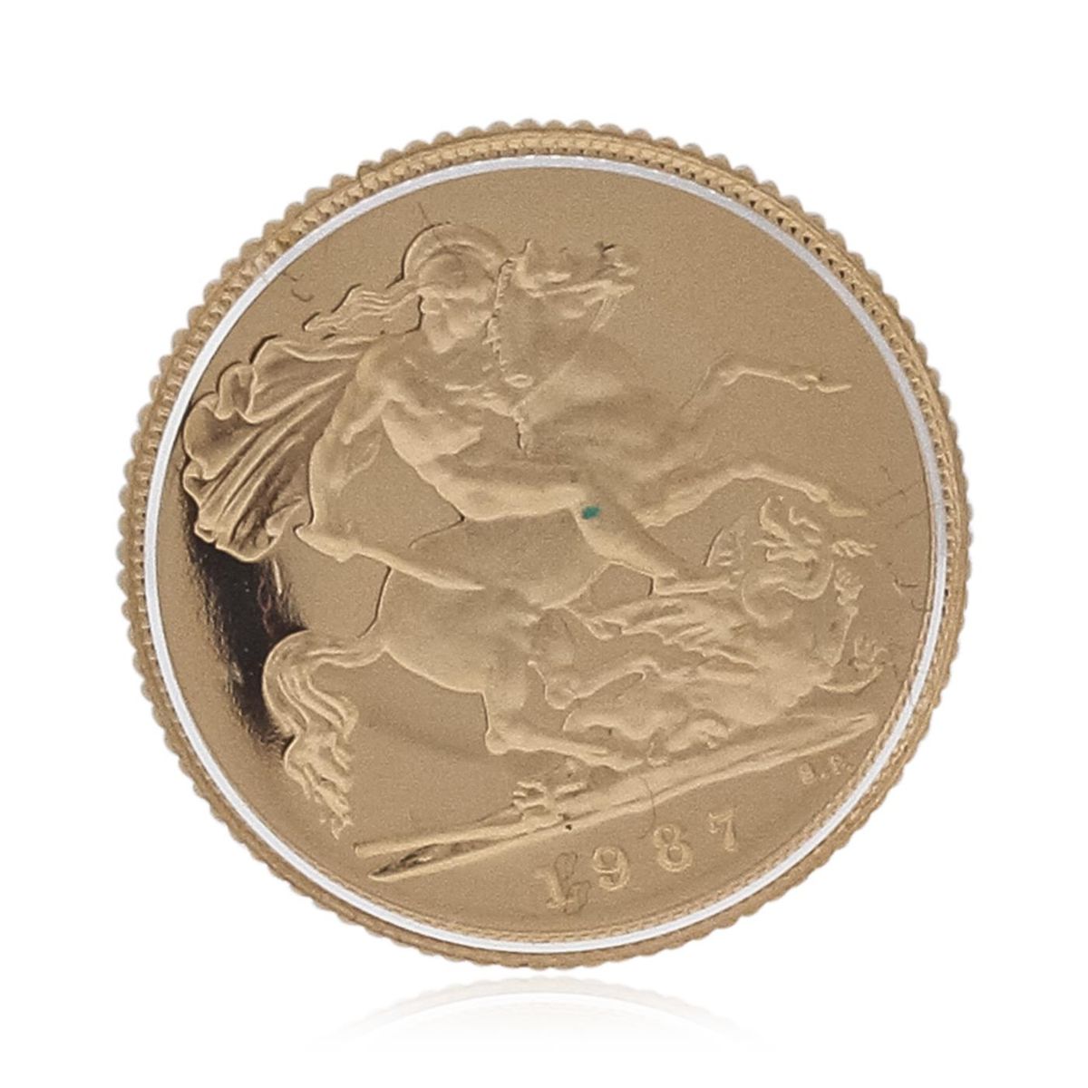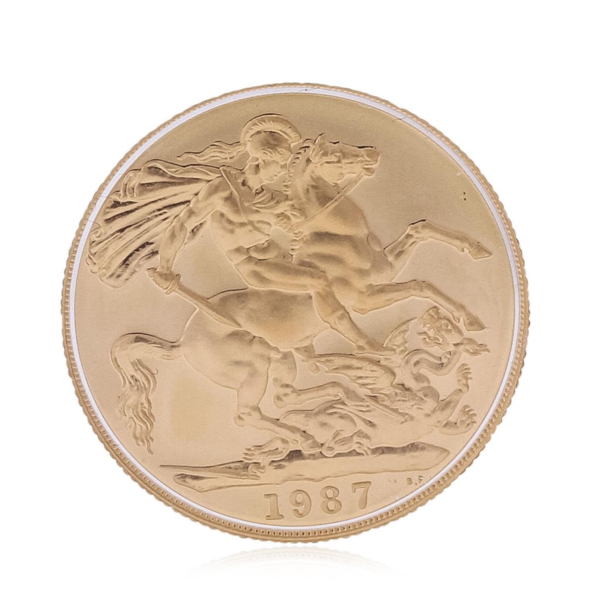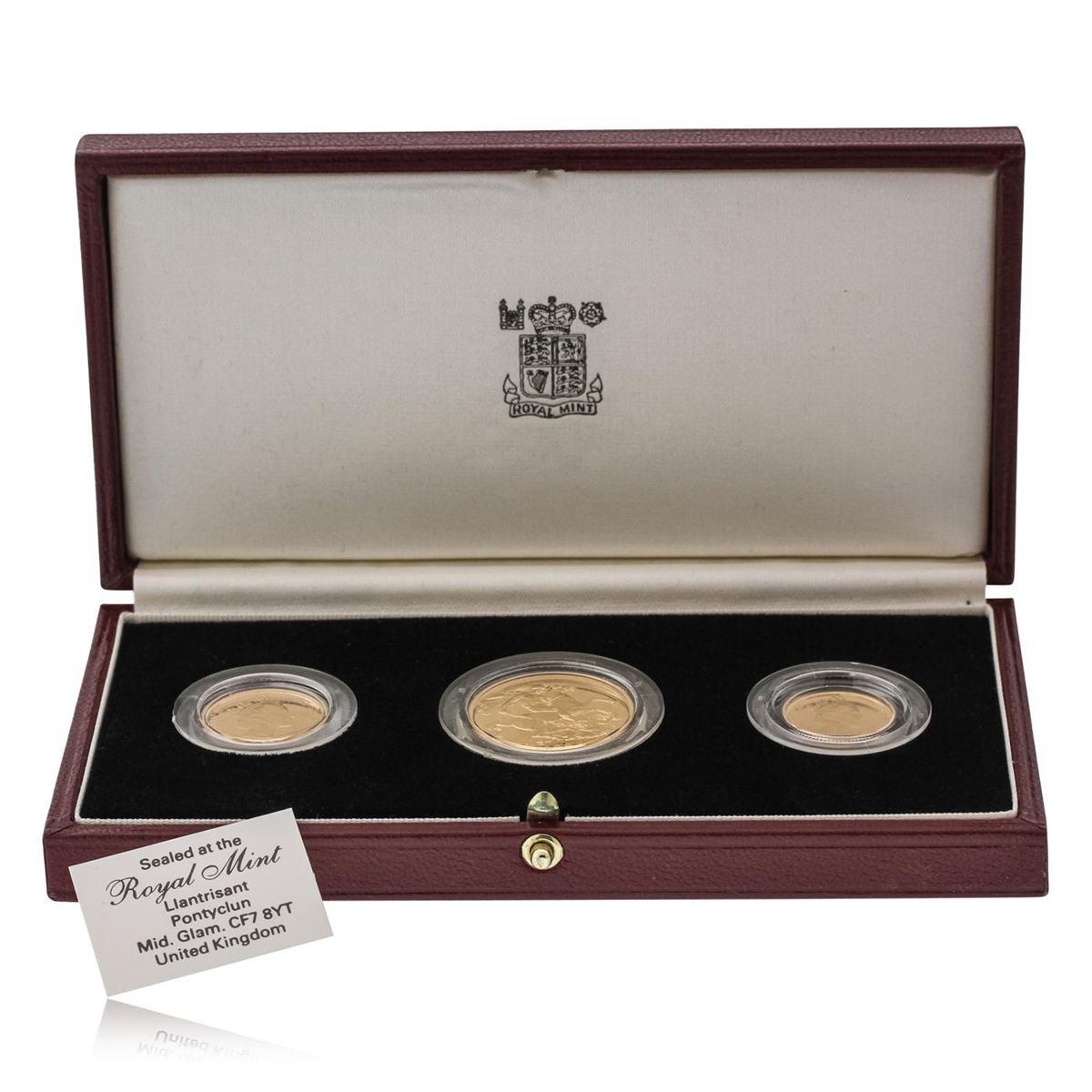 1987 United Kingdom Gold Proof Set complete with Original Box and Inserts. This set includes (3) 22 carat Gold Coins in Proof and Original Capsules. The three coins are broken down into (1) "Two Pounds" gold coin weighing 15.98 Grams, (1) "Sovereign" gold coin weighing 7.98 Grams, and (1) "Half Sovereign" gold coin weighing 3.99 Grams.