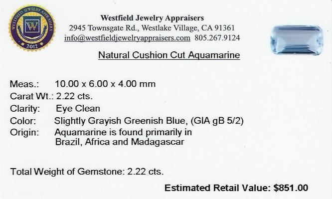 2.22ct Cushion Cut Natural Cushion Cut Aquamarine. Westfield Appraised at $851.00.