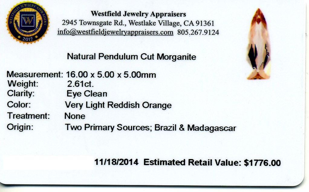 2.61ctw. Natural Pendulum Cut Morganite. Westfield Appraised at $1,776.00.