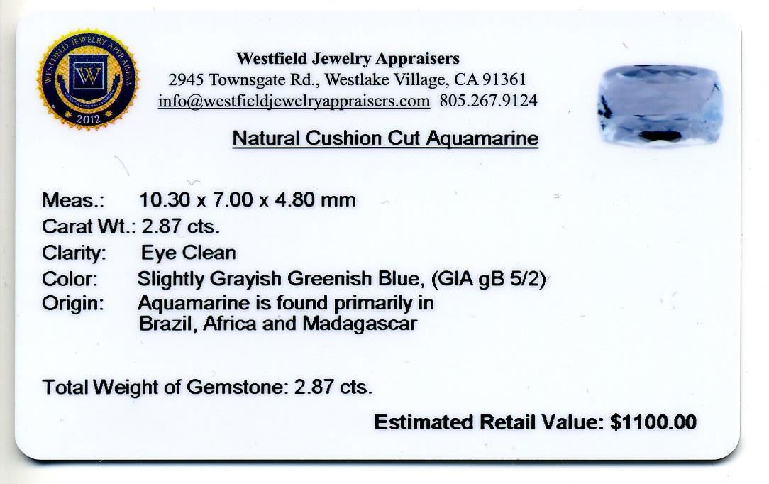 2.87ct Cushion Cut Natural Cushion Cut Aquamarine. Westfield Appraised at $1,100.00.