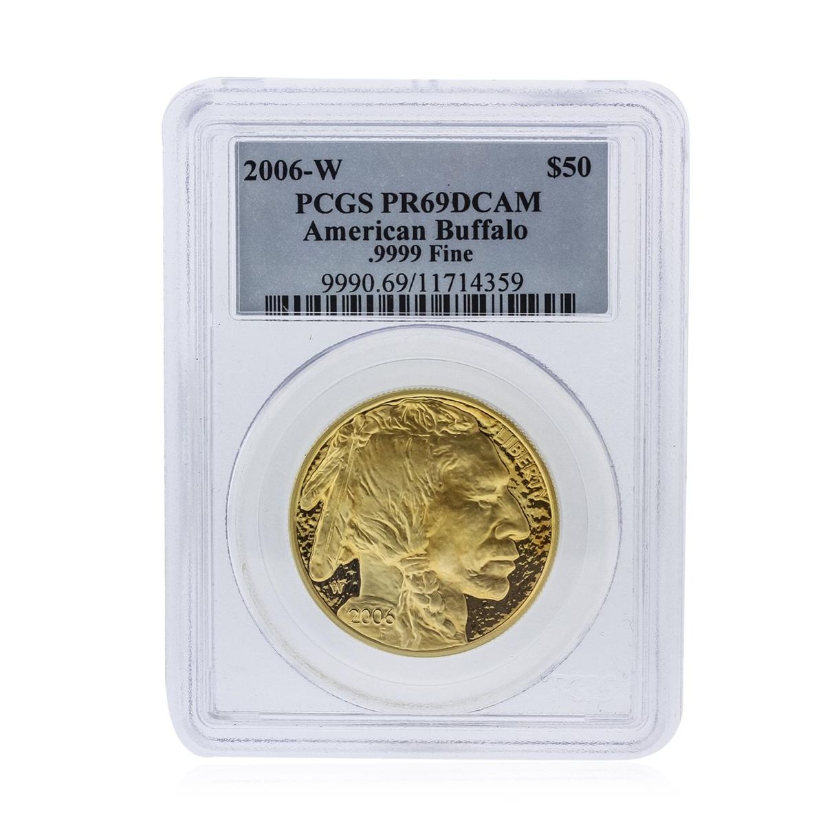 This gorgeous 2006-W $50 American Gold Buffalo Proof has been certified PR69 Deep Cameo by PCGS and comes complete with original Box and COA. This popular series marks the first time the U.S. Mint produced a .9999 fine 24-karat pure gold coin. A product of the West Point Mint, this 2006-W American Buffalo Proof features bold, strongly-struck devices on blazing gold fields. Many of these Deep Cameo Proofs have already become part of permanent collections, making now an ideal time to acquire this gorgeous and historic proof. From the exquisite details on the devices to the bright shining surfaces, this $50 Buffalo Proof is certain to please even the most discerning numismatist or Gold collector!