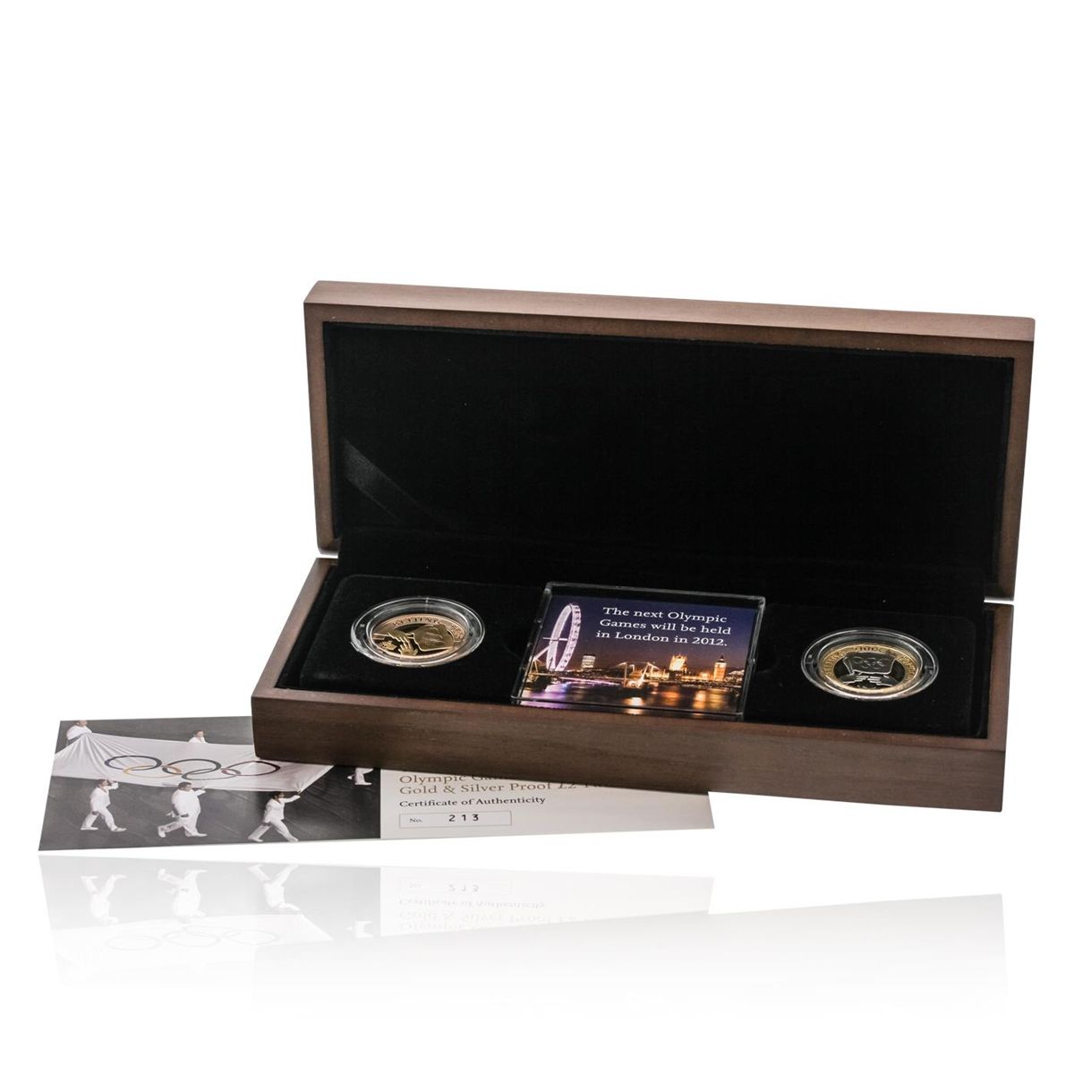 This set come complete with Box and Certificate of Authenticity. The set includes (1) 22carat Gold Coin weighing 15.98 grams, and (1) solid sterling silver coin with 24carat gold plating weighing 12.00 grams. In 2008 to commemorate the London Olympic Centenary and the Olympic Games Handover from London to Beijing the Royal Mint struck a very limited issue solid 22 carat Gold Proof £2 Two Pound 2 coin collection. In 2008, it will be the centenary of the first Olympic Games to be held in London and the Royal Mint has struck a commemorative solid 22 Carat Gold Proof £2 Two Pound Coin in celebration of the sporting achievements of the athletes who competed at that 4th Olympiad. The reverse designed by Royal Mint Engraver, Thomas T Docherty and shows a running track as the central image and the anniversary date of 1908. The reverse of the Olympic Handover £2 Two Pound Gold Proof coin is designed by the Royal Mint Engraving Team and bears the Olympic Flag and London 2012 logo. Surrounding the central design are the words Beijing 2008 and London 2012 along its outer ring, set against a backdrop of lines reminiscent of an athletic track. The obverse of both coins is the stunning portrait of Her Majest Queen Elizabeth II by Ian Rank Broadley. These legal tender coins have been struck to proof quality using specially prepared dies and highly polished blanks.