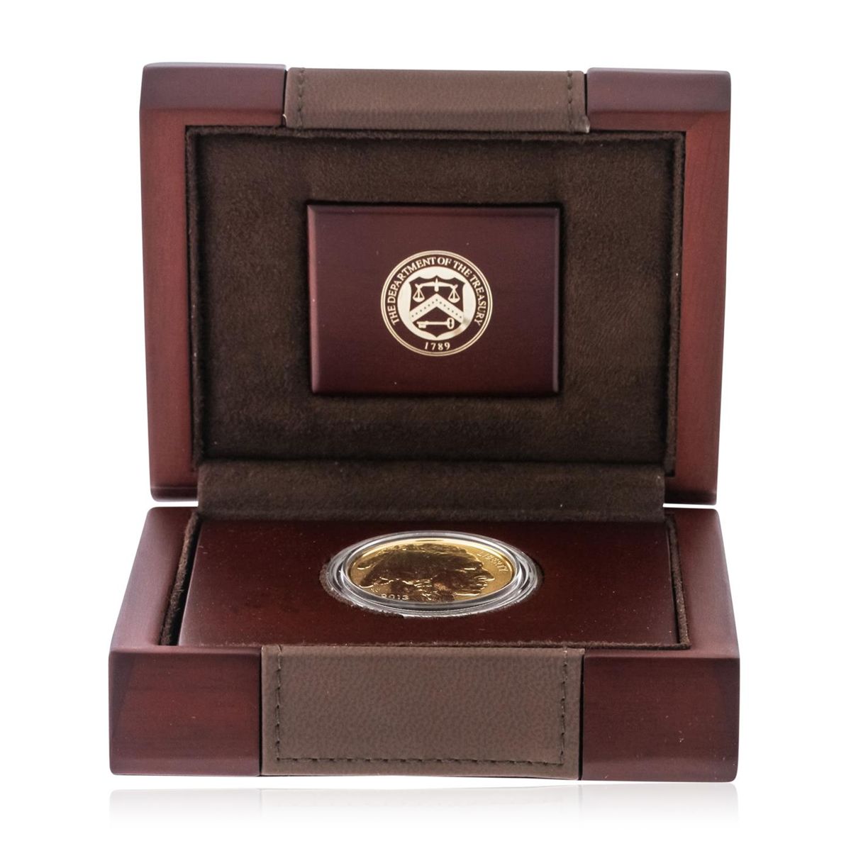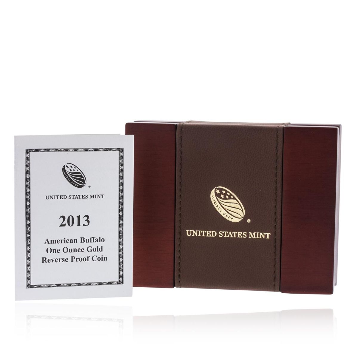 The 2013-W $50 American Gold Buffalo Reverse Proof gold bullion collectable coin is a product of the US Mint's facility at West Point and carries the "W" mint mark. Struck from .9999 fine, 24-kt. gold bullion--the purest of any United States gold coin--it contains a full troy ounce of the precious metal. This coin will come complete with the shown original leather and wood box directly from the U.S. Mint.