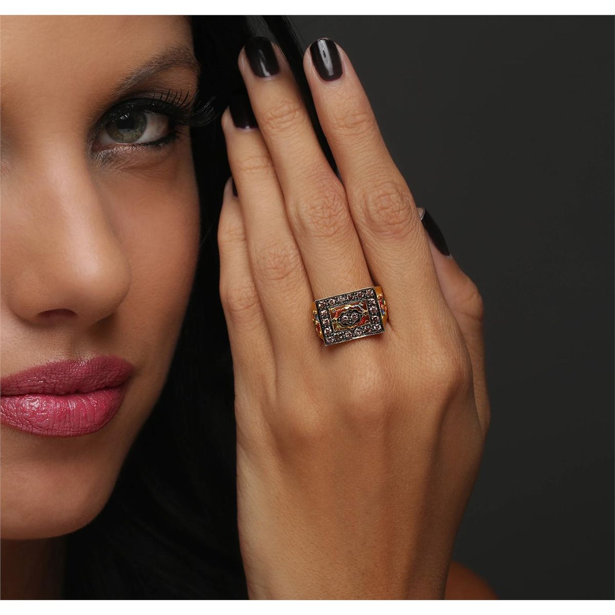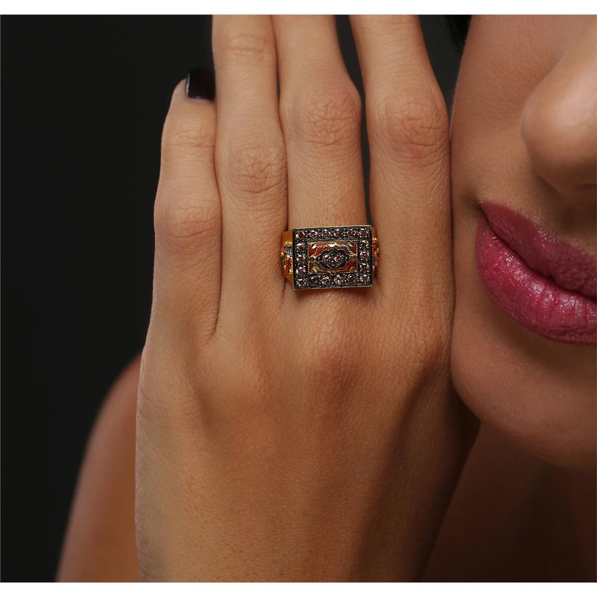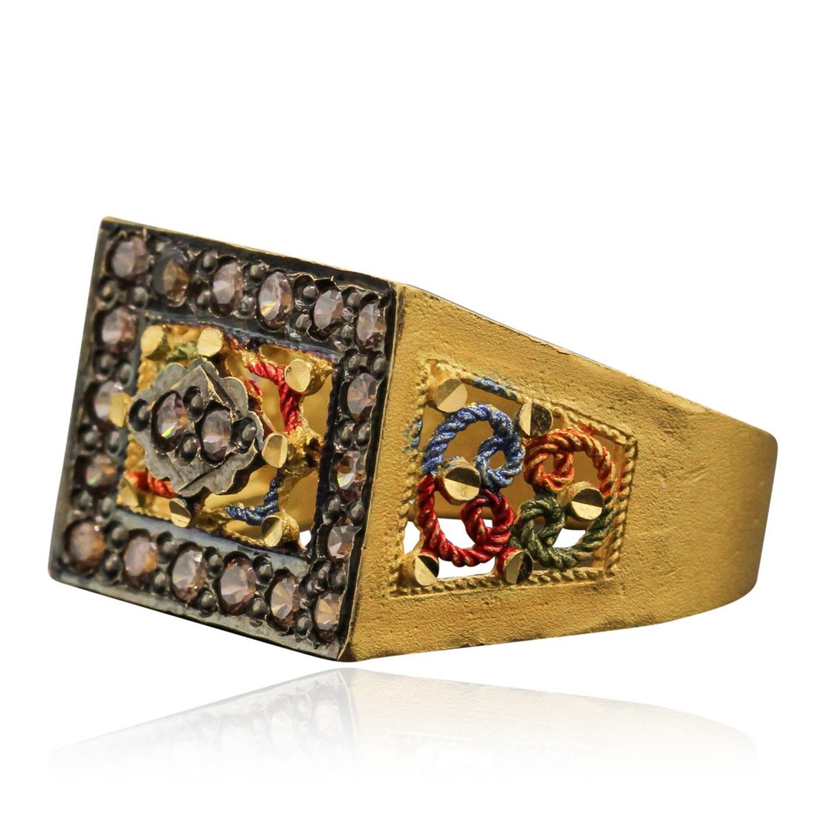 One band featuring: 21KT Yellow Gold, and Pave Set Round Pink Diamonds. Item weighs 6.80 grams.