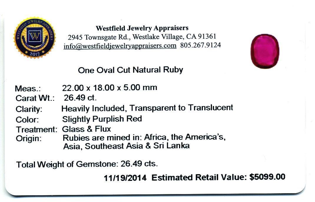 26.49ct. One Oval Cut Natural Ruby Westfield Appraised at $5,099.00.