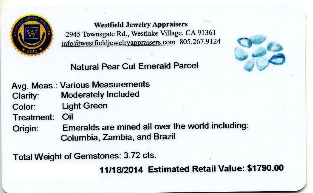 3.72cts. Natural Pear Cut Emerald Parcel Westfield Appraised at $1,790.00.