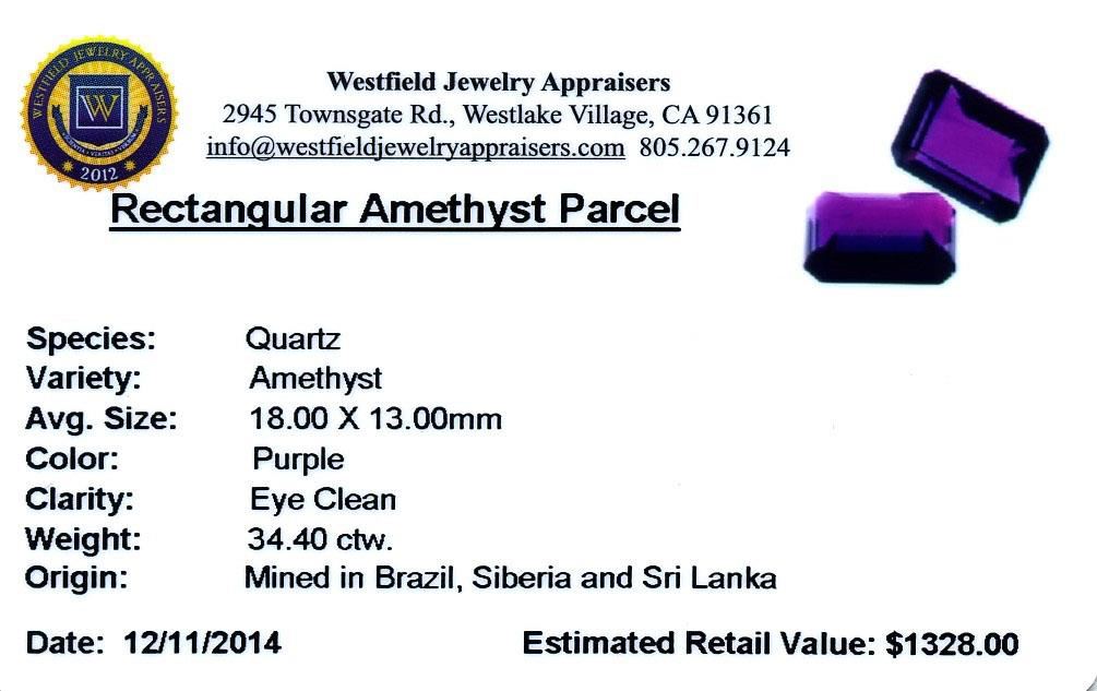 34.4ctw. Rectangular Amethyst Parcel Westfield Appraised at $1,328.00.