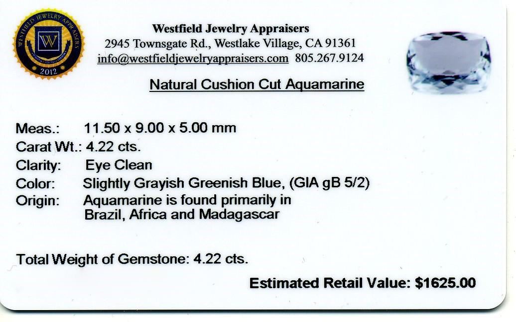 4.22ct Cushion Cut Natural Cushion Cut Aquamarine. Westfield Appraised at $1,625.00.