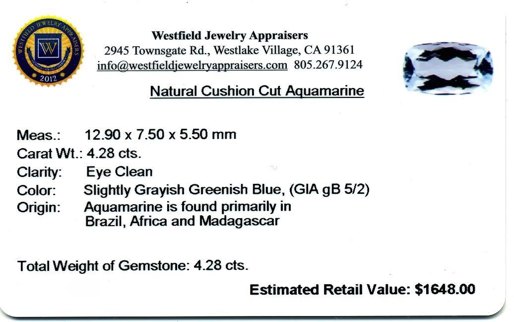 One 4.28ct Cushion Cut Natural Cushion Cut Aquamarine. Westfield Appraised at $1648.