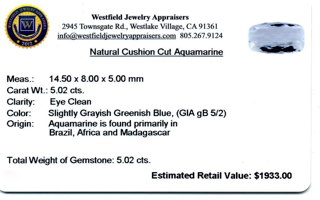 5.02ct Cushion Cut Natural Cushion Cut Aquamarine. Westfield Appraised at $1,933.00.