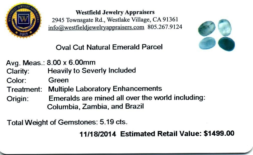 5.19cts. Oval Cut Natural Emerald Parcel Westfield Appraised at $1,499.00.
