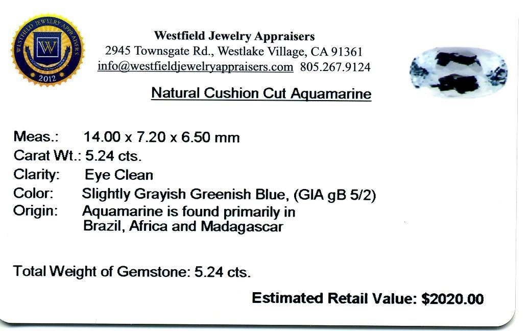 5.24ct Cushion Cut Natural Cushion Cut Aquamarine. Westfield Appraised at $2,020.00.