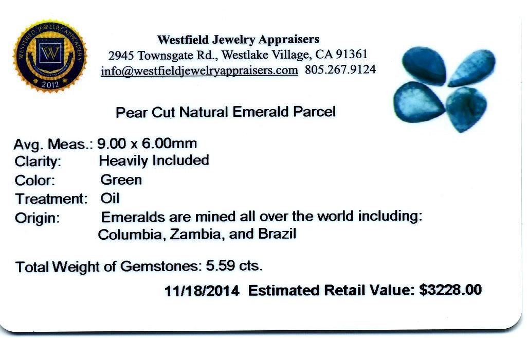 5.59cts. Pear Cut Natural Emerald Parcel Westfield Appraised at $3,228.00.