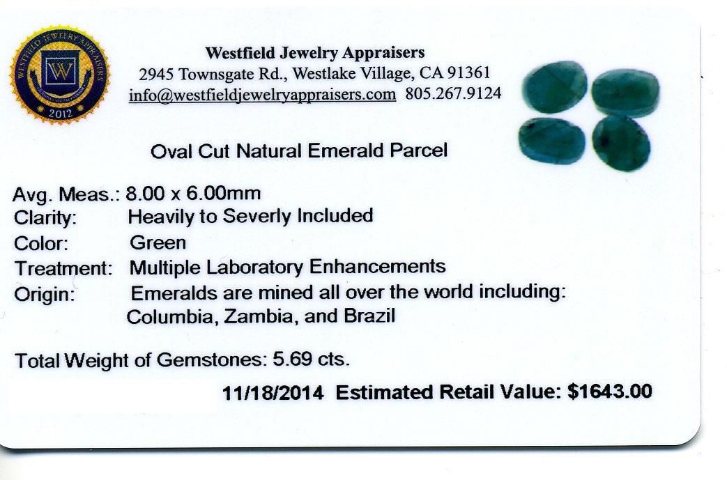 5.69cts. Oval Cut Natural Emerald Parcel. Westfield Appraised at $1643.00.