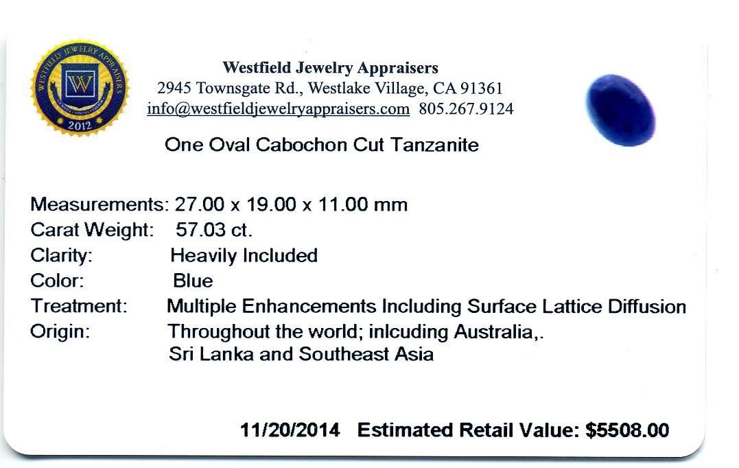 57.03ctw. One Oval Cabochon Cut Tanzanite. Westfield Appraised at $5,508.00.