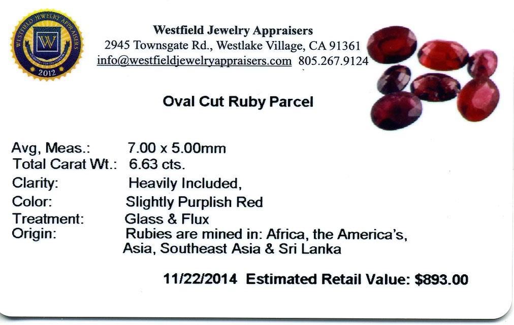 6.63ctw. Oval Cut Ruby Parcel. Westfield Appraised at $893.00.