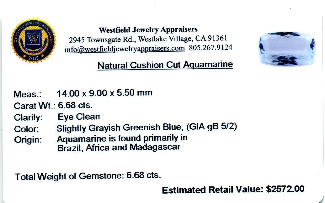 6.68ct Cushion Cut Aquamarine. Westfield Appraised at $2,572.00.