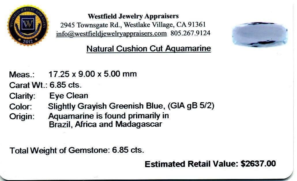 One 6.85ct Cushion Cut Natural Cushion Cut Aquamarine. Westfield Appraised at $2637.