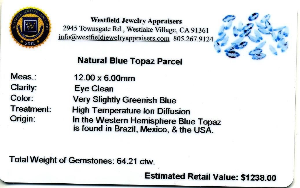 64.21cts Marquise Cut Natural Blue Topaz Parcel. Westfield Appraised at $1,238.00.