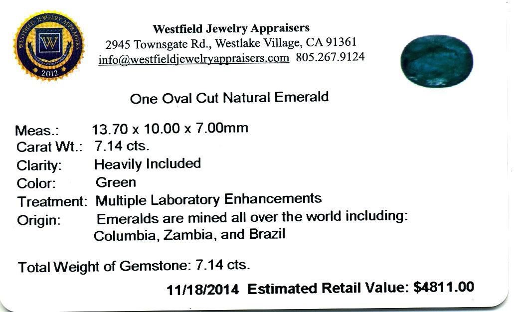 7.14ct. One Oval Cut Natural Emerald Westfield Appraised at $4,811.00.